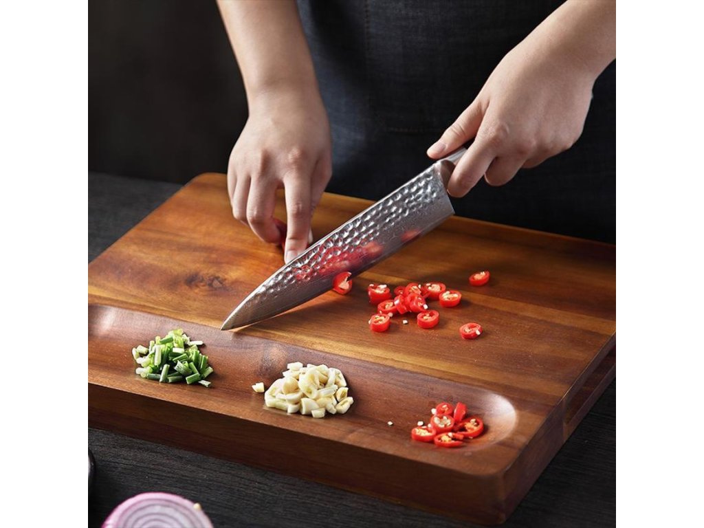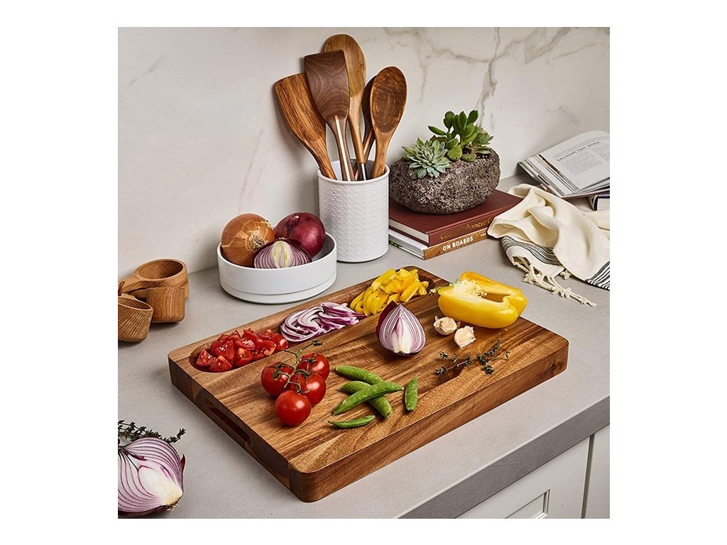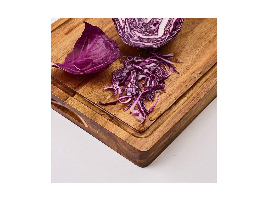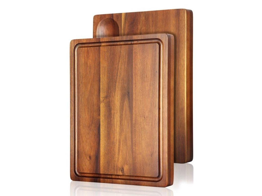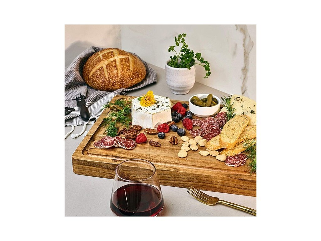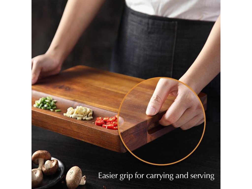 ✅ STABILNÍ – 38 mm silná deska z akáciového dřeva umožňuje stabilitu při řezání a vnitřní držadla Vám umožní snadné přenášení a podávání.