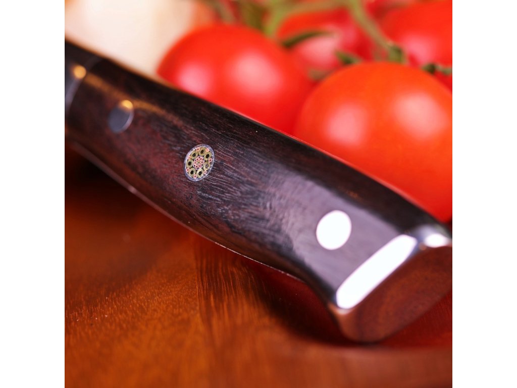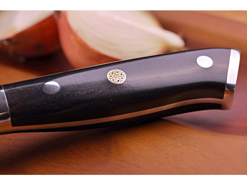 - Rukojeť: Rukojeť západního stylu je vyrobena z ebenového dřeva, ozdobena středovým mozaikovým nýtem, a pečlivě ručně leštěná. Je ergonomicky tvarovaná a navržena pro vynikající ruční ovládání. Speciální tvar záštity je vhodný pro asijský úchop nože. Trojité nýtování zajišťuje pevnost a stabilitu spojení mezi čepelí a rukojetí.