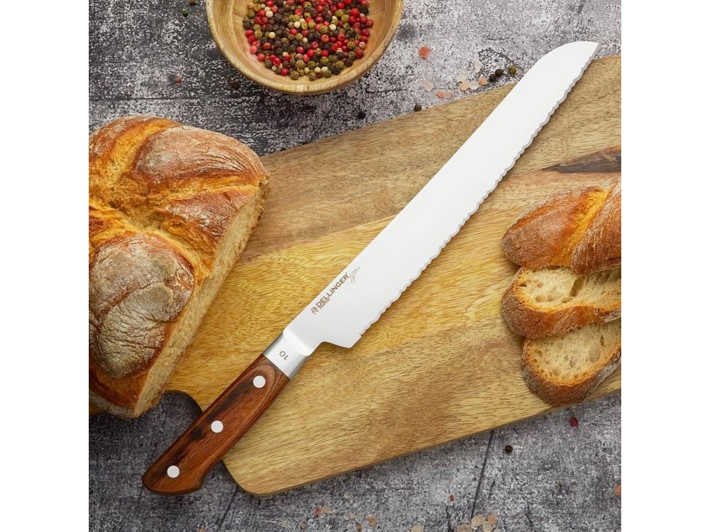 Chlebák Dellinger Essence – nůž, co má rád křupavý rána. Tohle není žádnej prcek na housky. S čepelí dlouhou 250 mm je to pořádnej krajáč, kterej si poradí s bagetou, kváskem i francouzským bochníkem bez jediné slzy.