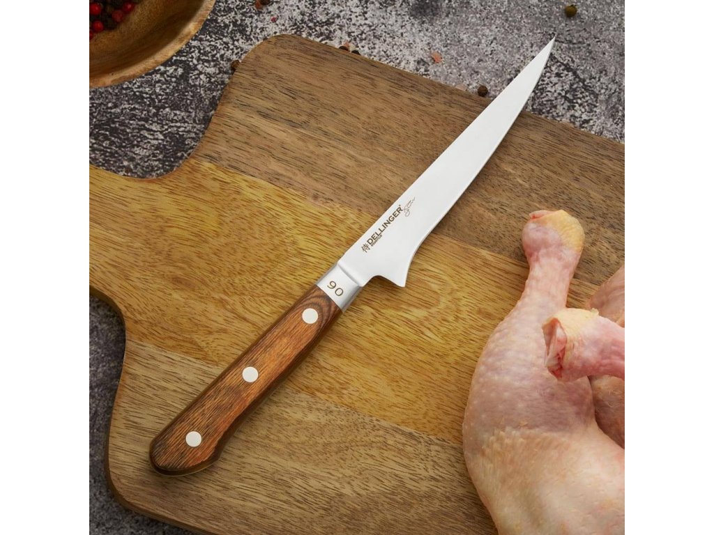 Kostěj Dellinger Essence – malej, hbitej a sakra přesnej. Tohle není žádnej pohádkovej zloduch, ale vykošťovací nůž, kterej oddělí maso od kosti tak ladně, že si toho ani nevšimneš.