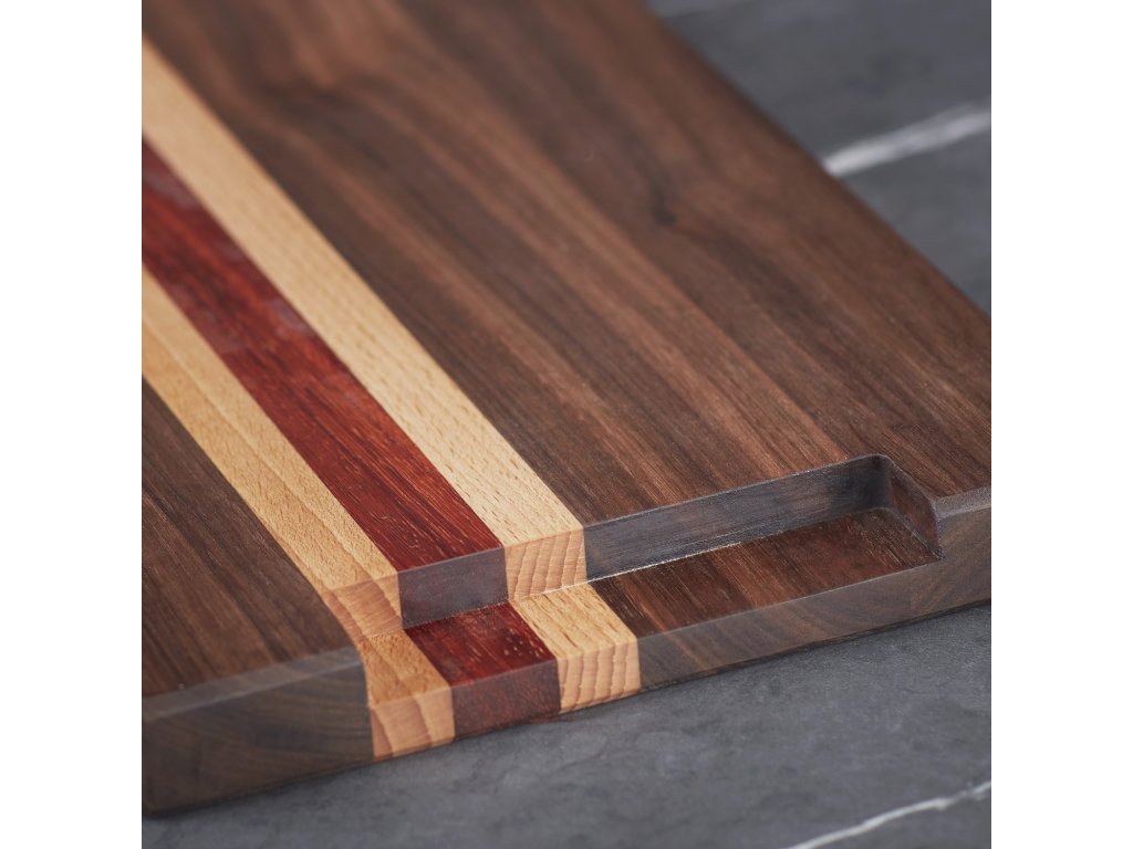 Prkénko je lepené tzv. na kant z bukového a ořechového dřeva a tropického dřeva padauk. Tento typ konstrukceje šetrný k Vašim nožům, protože se ostří nože dostává mezi jednotlivá vlákna a dochází k minimálnímu opotřebení. I mistři řeznického řemesla používají řeznické špalky, které jsou lepené stejnou technologí. Dále je prkénko napuštěno minerálním olejem a ošetřeno směsí minerálního oleje s včelím a karnaubským voskem.