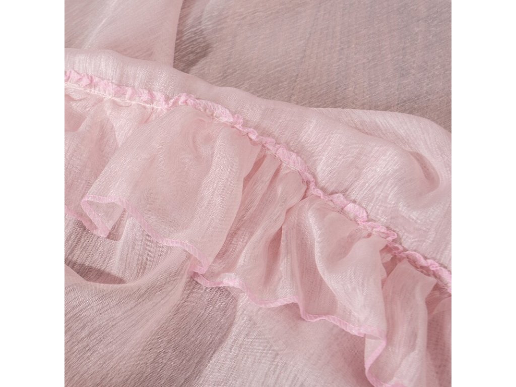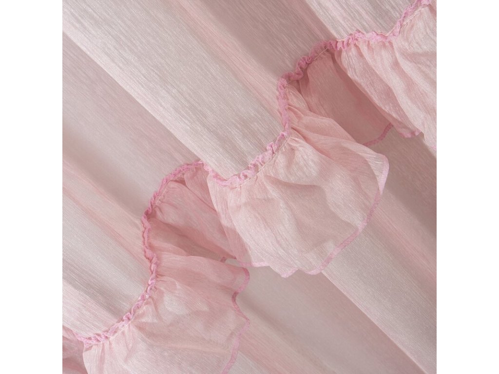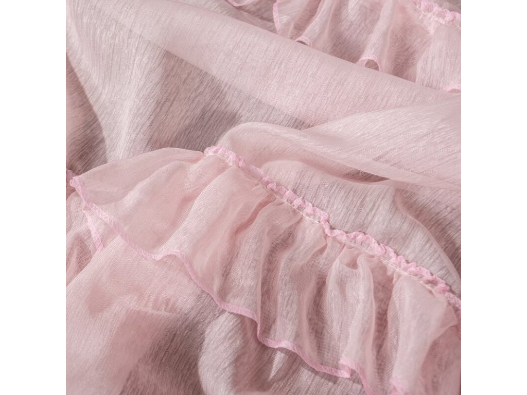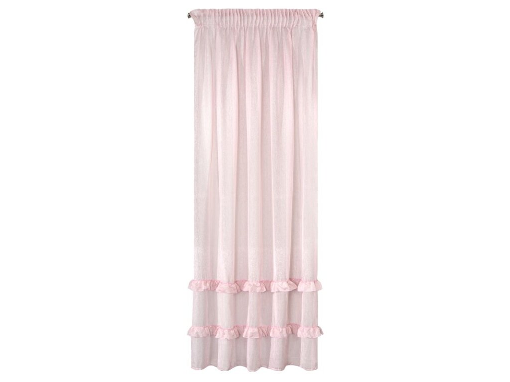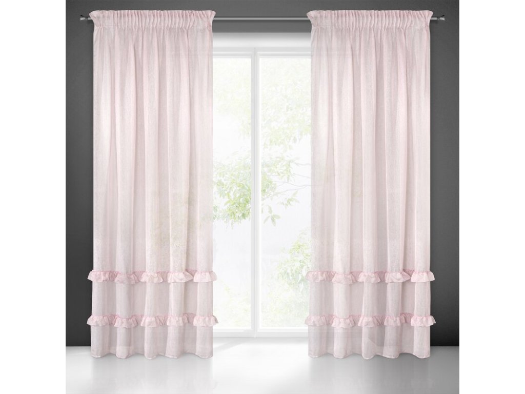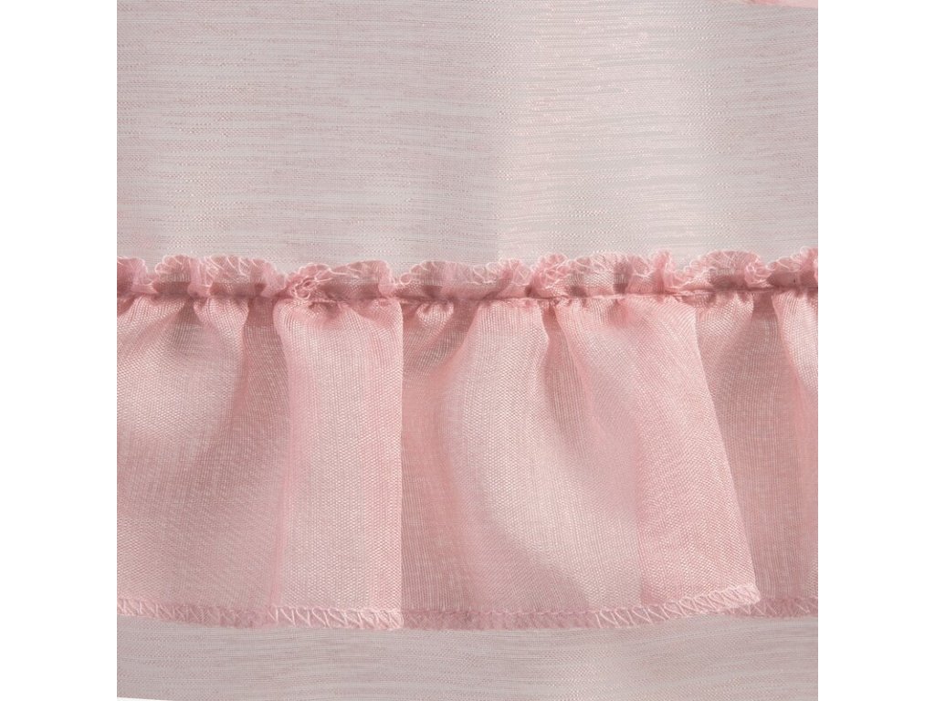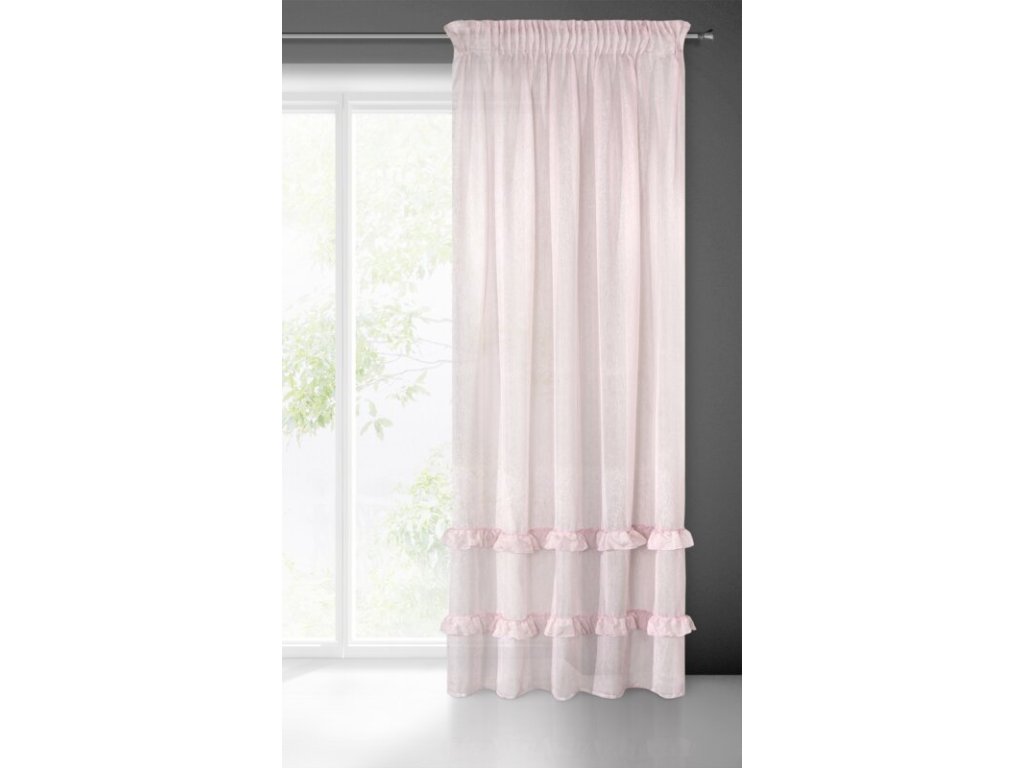 Lekka firana uszyta z tkaniny o strukrutze drobnego deszczyku udekorowana u dołu trzema falbanami. Romantyczna dekoracja sprawdzi się też jako lekka zasłona. szerokość: 140 cm, długość: 270 cm, kolor: RŮŽOVÝ, Gramatura: 50 GSM, Skład: 100% poliesterDoplňkové parametry