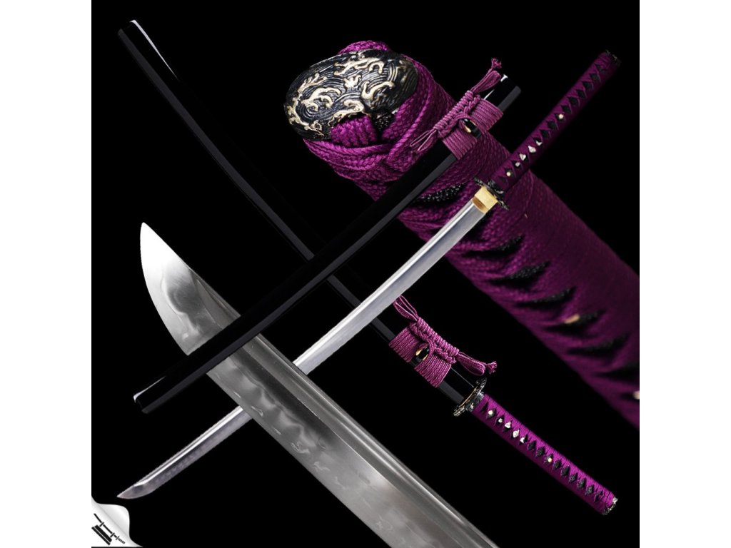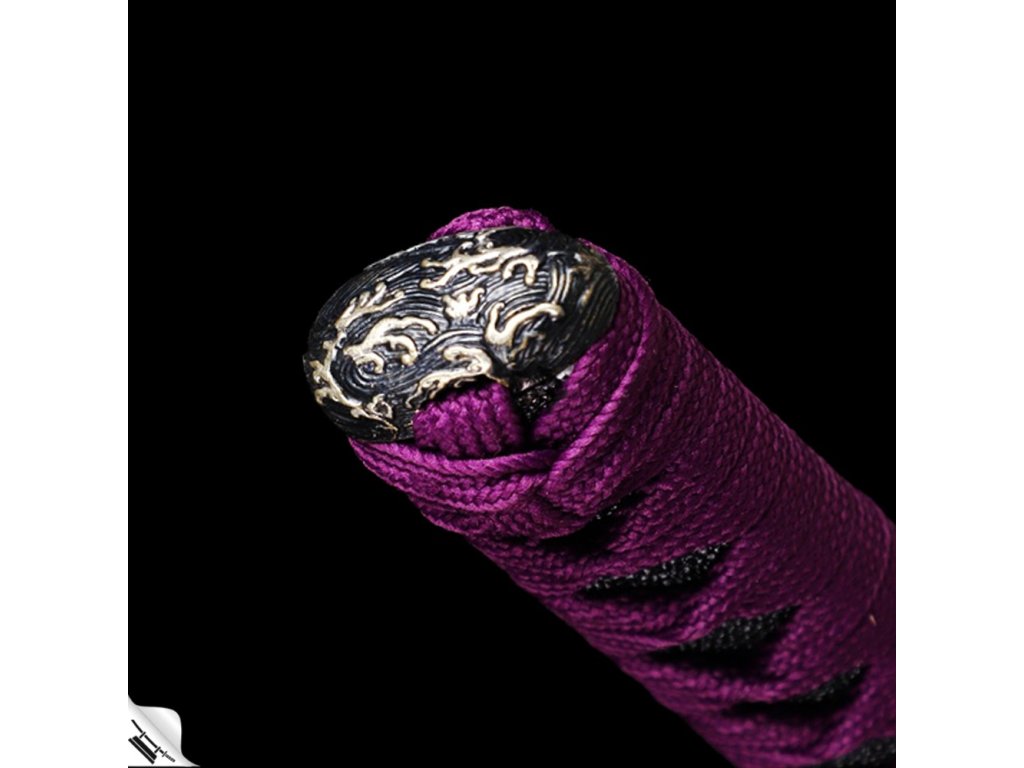 Rukojeť (tsuka) má dřevěné jádro potažené pravou rejnočí kůží (Samegawa) a je omotána fialovým hedvábím (Ito), které zajišťuje pevný a pohodlný úchop. Čepel je pevně zajištěna dvěma bambusovými kolíky (mekugi), což umožňuje snadnou demontáž pro údržbu.