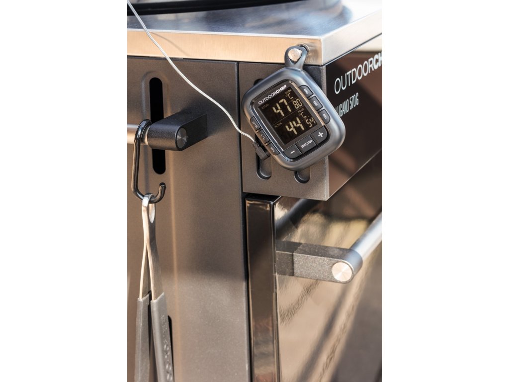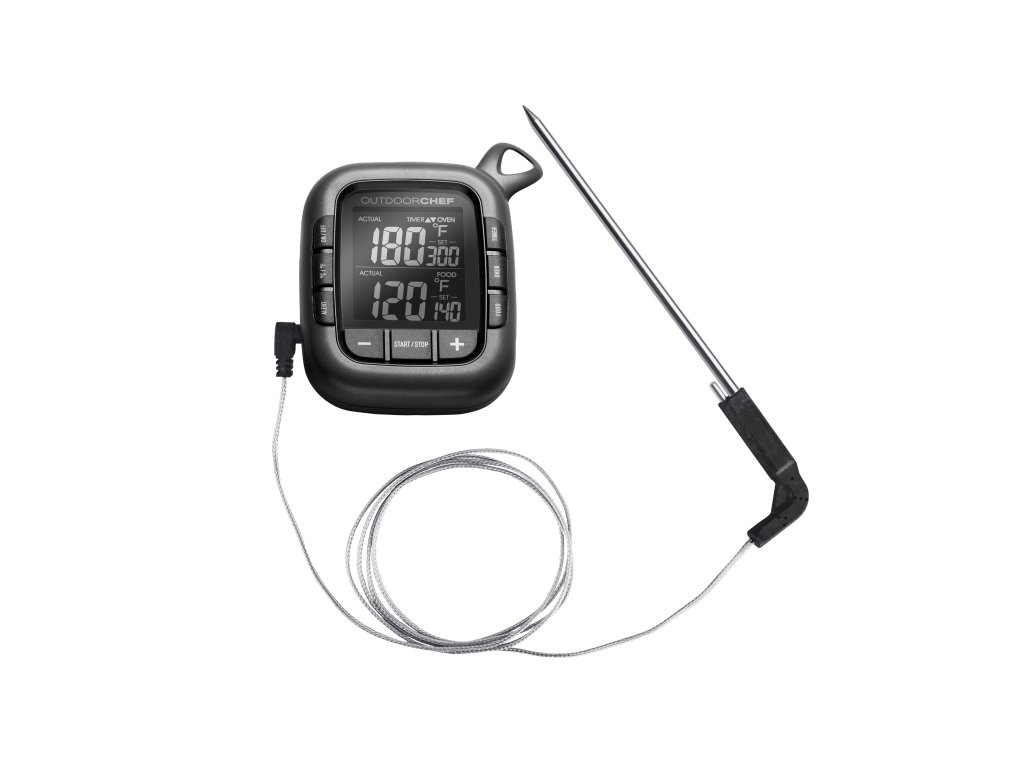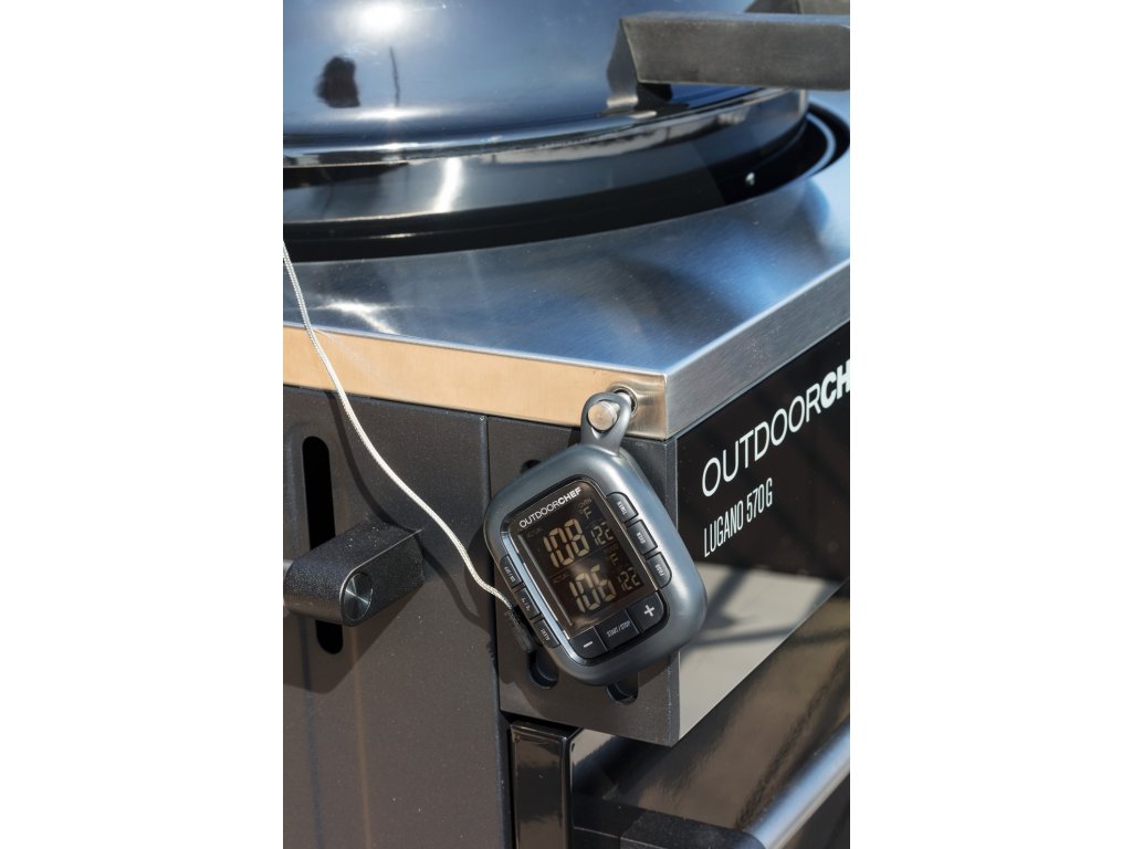 Vpichovací teploměr na grilování masa. Měří a současně ukazuje dvě teploty: teplota uvnitř masa + teplota okolí. Nastavitelný alarm na obě teploty. S jeho pomocí budou vaše steaky propečené vždy přesně podle vašeho přání a dokonale šťavnaté.