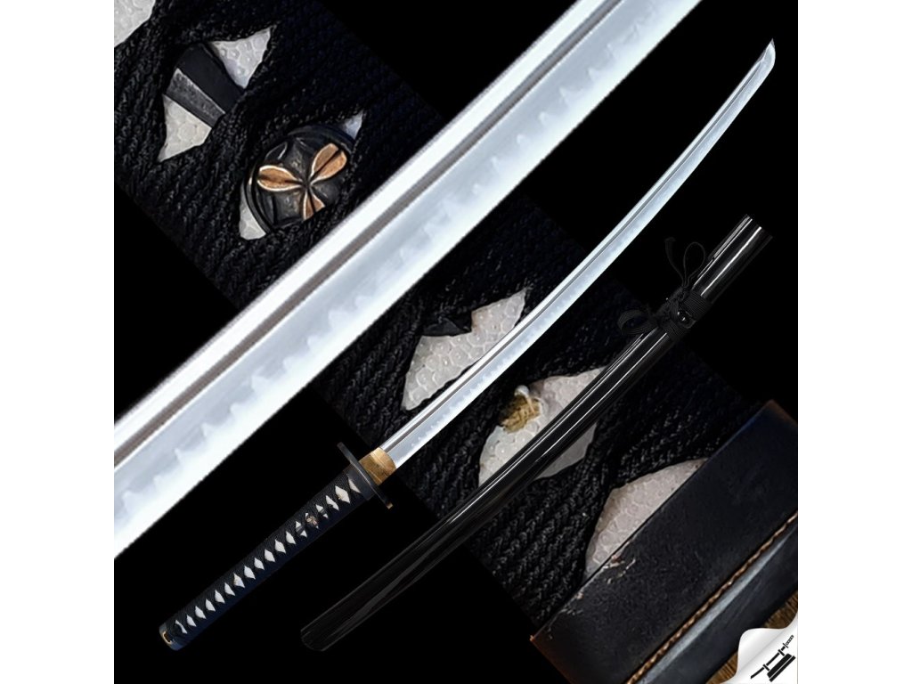 Kovaná čepel z oceli T-10 té nejvyšší kvality. Ocel byla laminována v monokompositnítní konfiguraci Maru - diferenciálně tvrzená. Uhlíková ocel T-10 (obsah 1,1% uhlíku a 0,4% manganu) je velmi pevná a skvěle drží ostrost. Výrazný reálný Choji Hamon je tvořen dle dávných tradičních metod, které vychází z mnohaletých zkušeností kovářského mistra. Po ručním broušení a leštění je povrch čepele jako zrcadlo. Čepel byla ve finální fázi leštěna kamenem hazuya - tím je dosaženo téměř žiletkového ostří (razor sharp). Jedná se o špičkovou repliku samurajského meče, která je vhodná k sekovým zkouškám a lze ji rozložit na jednotlivé části. Tato čepel byla vyzkoušena a testována tak, aby odstranila vše co jí stojí v cestě ! Sori (zakřivení čepele) je speciálně navrženo tak, aby bylo dosaženo co možná nejjemnějších a nejčistších řezů. To vše v kombinaci s výběrem tradičního Koshirae zaručuje, že získáte to nejlepší z hlediska vzhledu i funkčnosti. Uhlíková ocel T-10 má působivou tvrdost ve škále HRC- perfektní kombinace této tvrdosti je podtrženo zakřivením čepele Sori, které umožňuje snadné přeseknutí tatami, slaměné rohože, nebo bambusu pro tameshigiri. Full tang konstrukce této katany výrazně zvyšuje sílu meče. Hrot čepele je tvarovaný shinogi-zukuri a chu kissaki se skutečným Diamond-Shaped Yokote, které je velmi dobře definováno tím, že hamon prochází po celé délce přes Boshi.