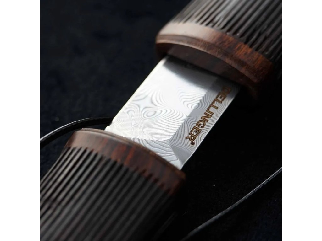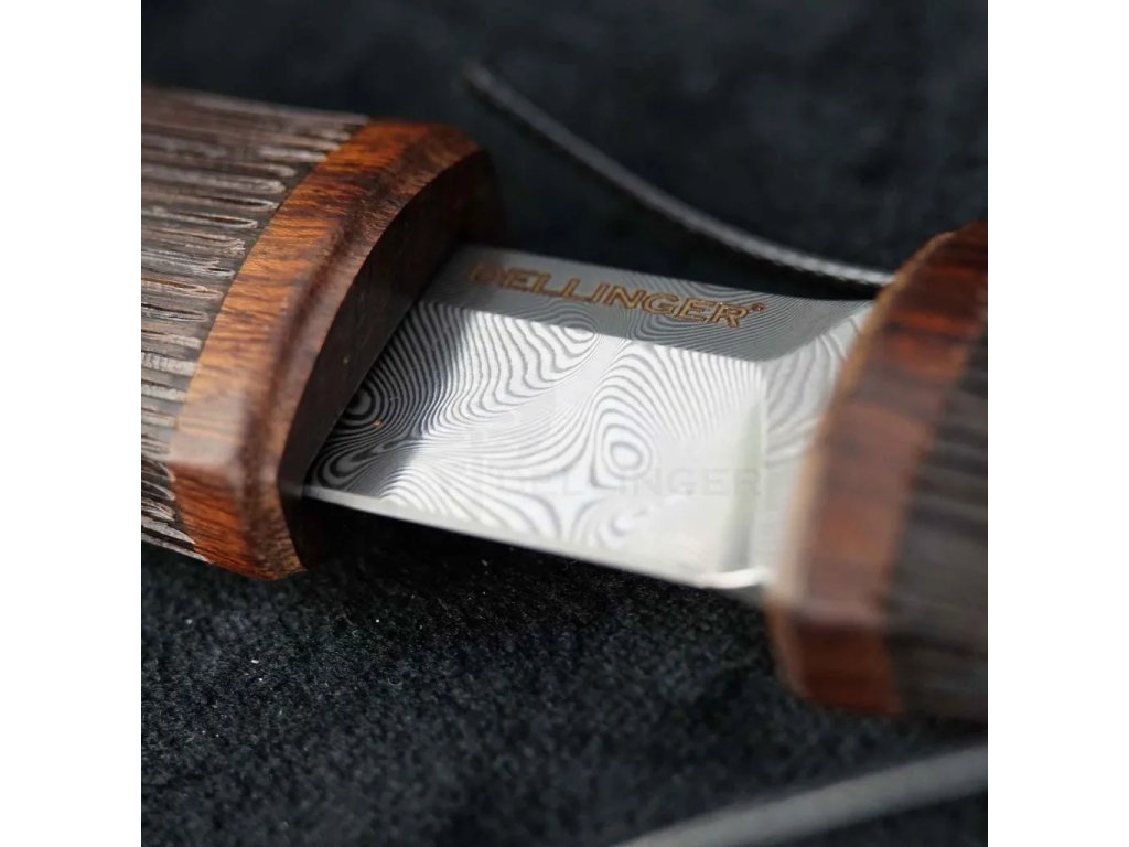 Pevný nůž Dellinger Hunter Damascus je lovecký nůž s vyobrazením jelena přímo na čepeli. Tato čepel je vyrobena z damaškové oceli VG-10. Ocel je nerezová, velmi odolná vůči opotřebení a dobře zpracovaná. Dosahuje tvrdosti až 61 HRC, díky tomu vydrží ostří dlouho ostré. Vrstvený damašek na čepeli vypadá velmi elegantně. Rukojeť je vyrobena ze stabilizovaného barveného dřeva topolu. Překrásné dřevo a vyjímečnou kresbou. Pouzdro je vyrobené z kvalitní hovězí kůže zdobené hadí kůží.