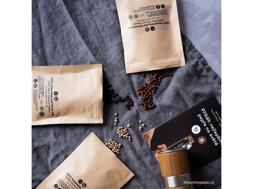 Součástí balení je brožura Příběh nejlepšího pepře na světě s certifikáty pravosti a informacemi o Kampotském pepři.