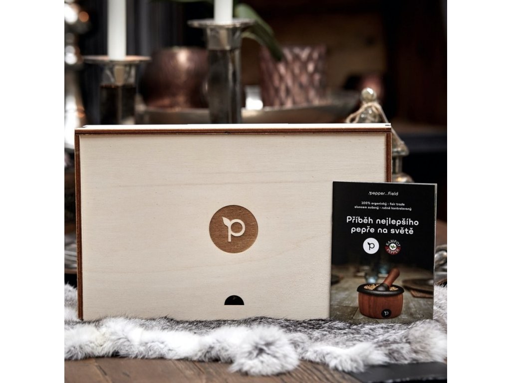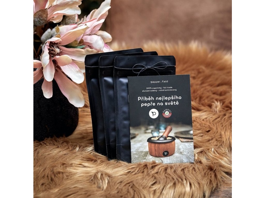Součástí balení je brožura Příběh nejlepšího pepře na světě s certifikáty pravosti a informacemi o Kampotském pepři.