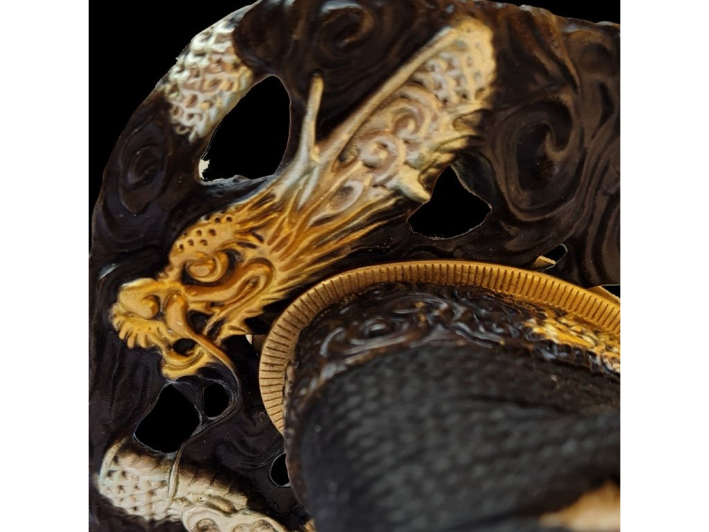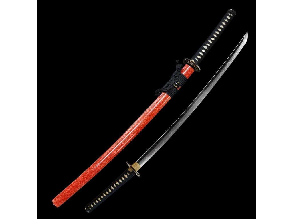 Reálný Choji hamon je tvořen dle dávných tradičních metod, které vychází z mnohaletých zkušeností kovářských mistrů. Tento proces vytváří na čepeli překrásný hamon Hada a Martensite (zrna). Jedná se o špičkovou repliku samurajského meče, která je vhodná k sekovým zkouškám a lze ji rozložit. Tato čepel byla vyzkoušena a testována tak, aby odstranila vše co jí stojí v cestě ! Sori (zakřivení čepele) umožňuje provádění sekání tak, aby bylo dosaženo co možná nejjemnějších a nejčistších řezů. To vše v kombinaci s výběrem tradičního Koshirae zaručuje, že získáte to nejlepší z hlediska vzhledu i funkčnosti. Monokompositnítní uhlíková ocel AISI 1075 má působivou tvrdost ve škále HRC- perfektní kombinace této tvrdosti je podtrženo zakřivením čepele Sori, které umožňuje snadné přeseknutí tatami, slaměné rohože, nebo bambusu pro tameshigiri. Full tang konstrukce této katany výrazně zvyšuje sílu meče. Hrot čepele je tvarovaný shinogi-zukuri a shubo zukuri kissaki (špičatý hrot), který je velmi dobře definován tím, že hamon prochází po celé délce přes Boshi.