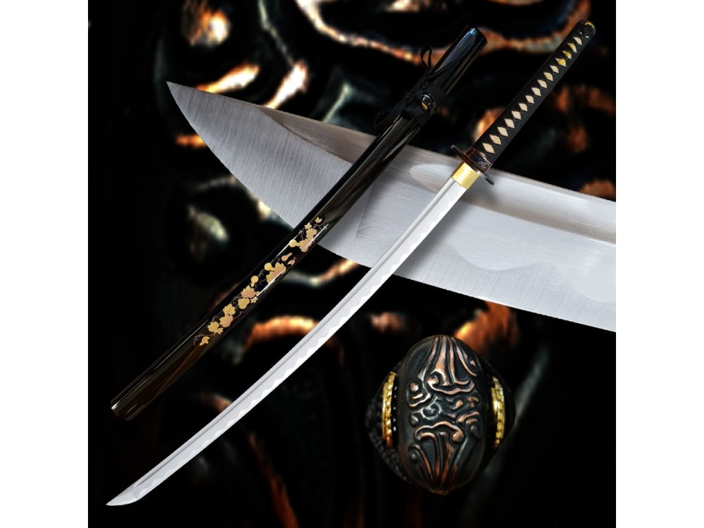 Kovaný japonský meč KATANA s leštěnou imitací kalení (hamonu) a žlábkem Bo-Hi. Ostrý (broušený) samurajský meč KATANA najde své uplatnění jako dekorace, ale i k aktivnímu nácviku bojového umění. Katana není zcela vhodná k sekání tvrdších materiálů. Ocel není parciálně zakalena (hamon je pouze leštěný) a proto má nízký stupeň tvrdosti. Sekání tvrdých materiálů by zanechalo stopy na ostří meče. Atraktivní a ostrá čepel, černá lesklá zdobená saya plus tsuka (rukojeť), která je potažena pravou rejnočí kůží, to vše dělá tuto katanu velmi zajímavou a žádanou. Katana je uložena v černém plátěném vaku a papírové krabici. Tento japonský meč katana je možné kombinovat do setu s Wakizashi Flowers (W-638) a tanto Flowers (T-652). Ostří katany zdobí leštěná imitace kalicí linky hamonu. Firma Dellinger se zříká jakékoliv odpovědnosti za zranění a poškození vzniklá při použití. Schraňujte katanu mimo dosah dětí ! Jakákoliv manipulace se samurajským mečem je na vaší vlastní odpovědnost. Nezapomeňte, že máte ve svých rukou smrtelnou zbraň !