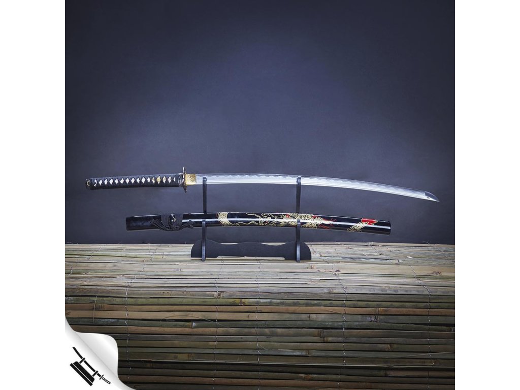 Kovaný japonský meč KATANA s leštěnou imitací kalení (hamonu) a žlábkem Bo-Hi. Ostrý (broušený) samurajský meč KATANA najde své uplatnění jako dekorace, ale i k aktivnímu nácviku bojového umění. Katana není zcela vhodná k sekání tvrdších matreriálů. Ocel není parciálně zakalena (hamon je pouze leštěný) a proto má nízký stupeň tvrdosti. Sekání tvrdých materiálů by zanechalo stopy na ostří meče. Atraktivní a ostrá čepel, černá lesklá zdobená saya plus tsuka (rukojeť), která je potažena pravou rejnočí kůží, to vše dělá tuto katanu velmi zajímavou a žádanou. Katana je uložena v černém plátěném vaku a papírové krabici. Ostří katany zdobí leštěná imitace kalicí linky hamonu. Firma Dellinger se zříká jakékoliv odpovědnosti za zranění a poškození vzniklá při použití. Schraňujte katanu mimo dosah dětí ! Jakákoliv manipulace se samurajským mečem je na vaší vlastní odpovědnost. Nezapomeňte, že máte ve svých rukou smrtelnou zbraň !