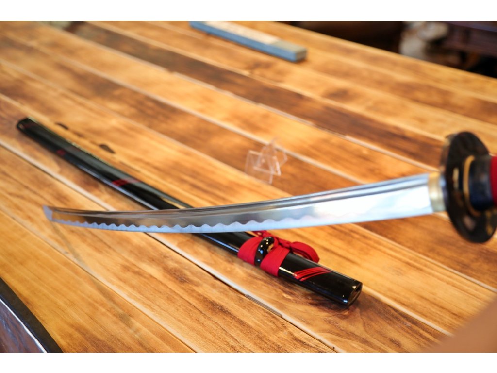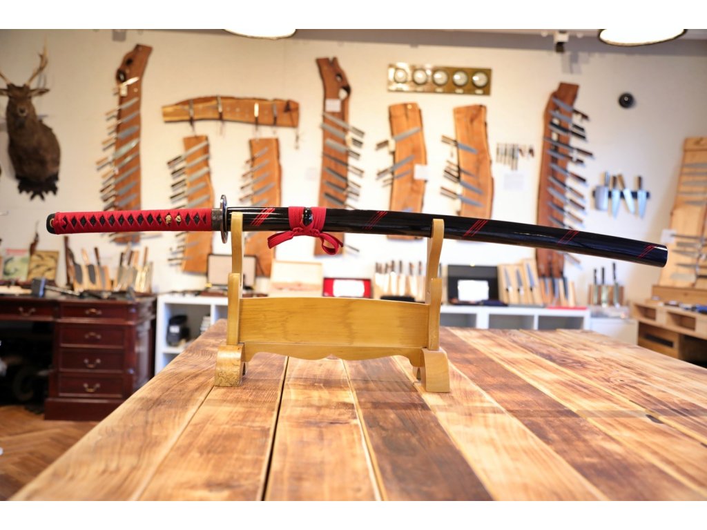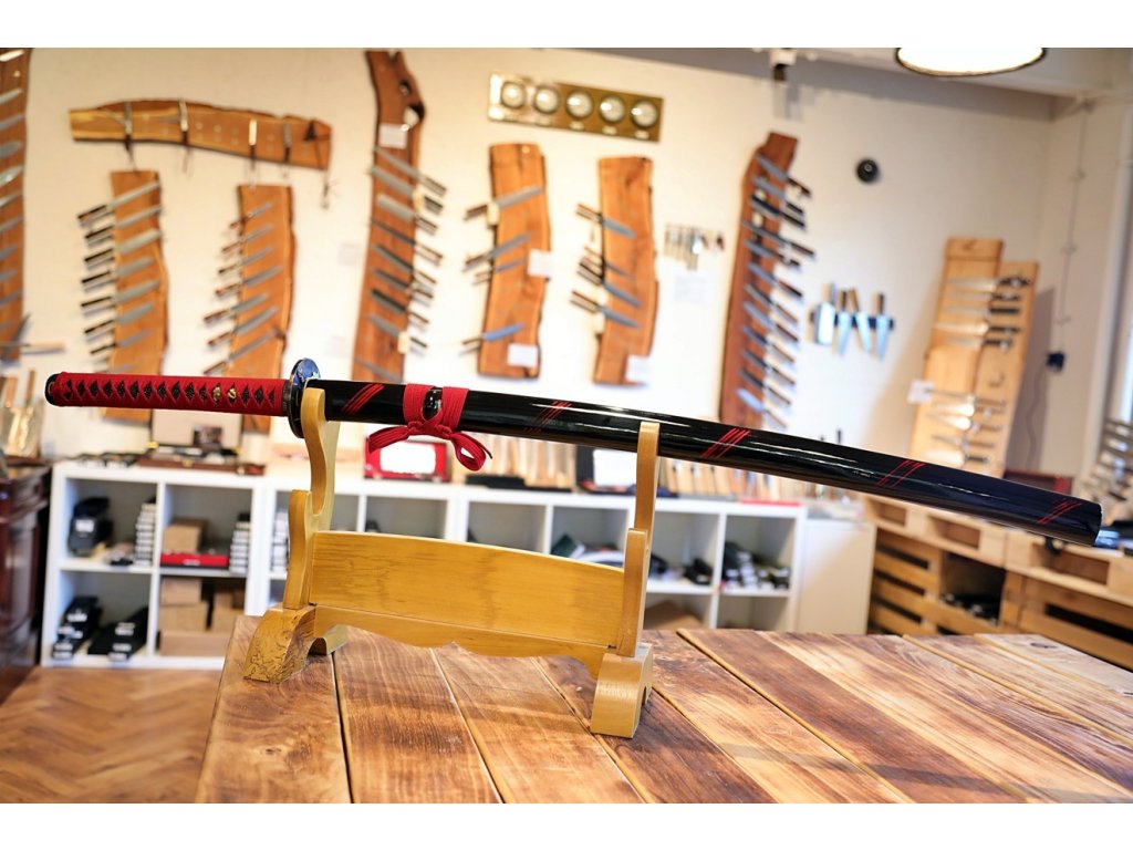 Ručně kovaná katana TAKEHIKO z ocelí AISI 1045 s imitací hamonu. Černá matná saya je kombinována červenými vzory s červeným opletem a tmavou tsubou. Dostupný dárek pro milovníka vzdálené země. Tato broušená, ostrá katana se dá rozložit, je dodávána v černém plátěném vaku. Stojánek neni součástí tohoto meče.