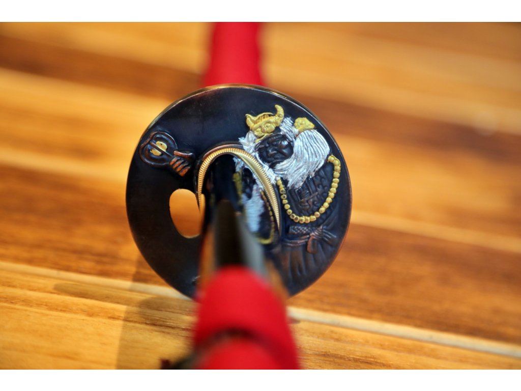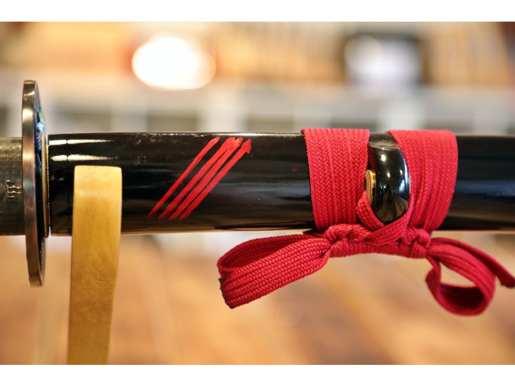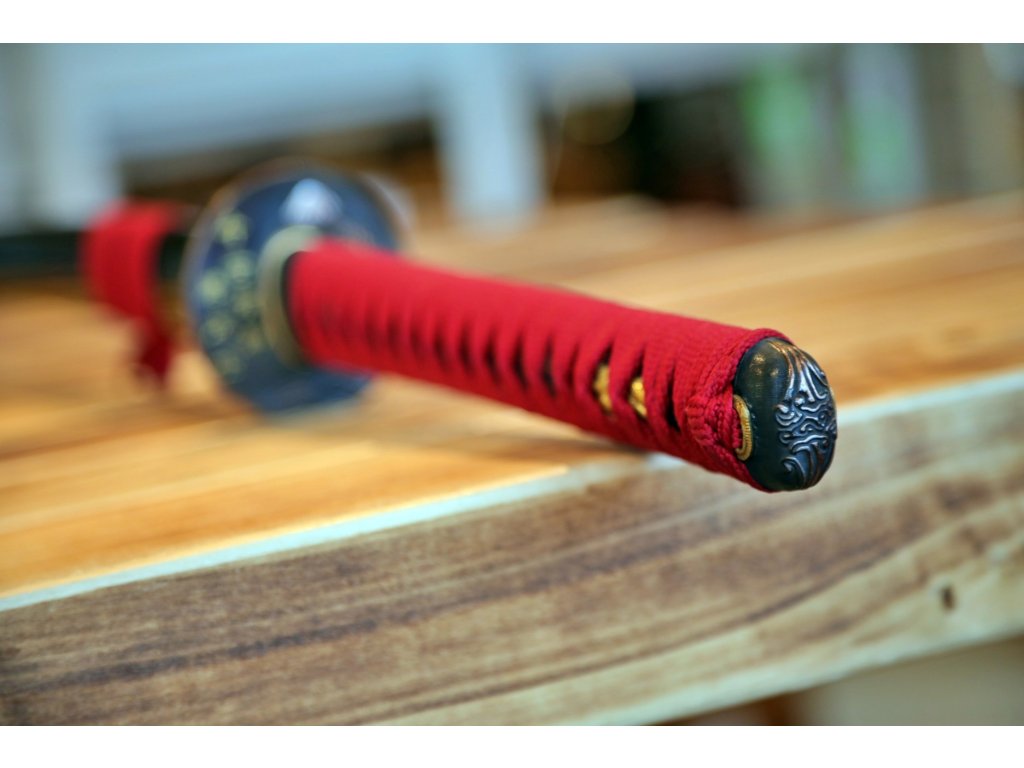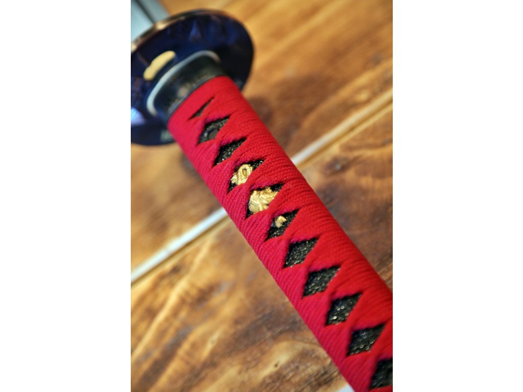 • Tsuka (rukojeť) – dřevěné jádro, potažena pravou rejnočí kůží (Samegawa) opletem červené barvy - Ito. Čepel katany je zajištěna dvěma mekugi (kolíky). Čepel od rukojeti můžete odmontovat vytažením těchto kolíků. Na každé straně Tsuky je menuki (ornament).