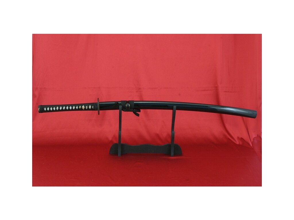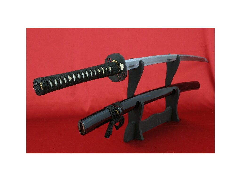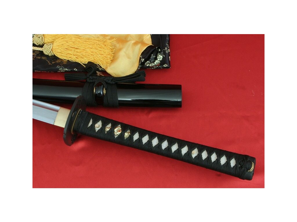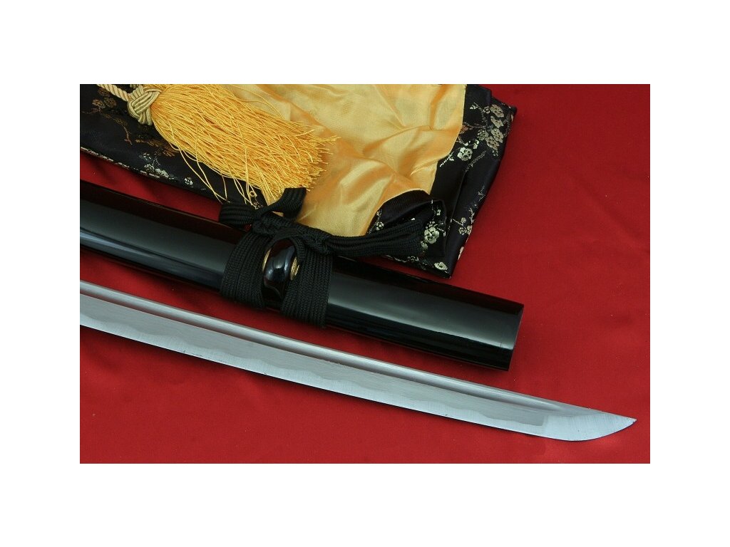 Ručně kovaná katana URUTO z překládané oceli od firmy Kawashima. Klasicky provedená katana v černém odstínu se zajímavou čepelí, katanu lze rozložit, je dodávána v černém látěném vaku.