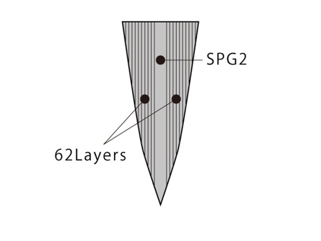 Ultra ostré jádro z práškové oceli SPG2 je chráněno proti korozi a má trvanlivou ostrost s tvrdostí R63 +/- 1 Rockwella. Jádro je obklopeno 62 vrstvami nerezové damascénské oceli, což zajišťuje výjimečnou odolnost. Čepel, precizně zúžená a s třpytivým damascénským vzorem, minimalizuje tření při řezu a zabraňuje přilepení krájeného materiálu.