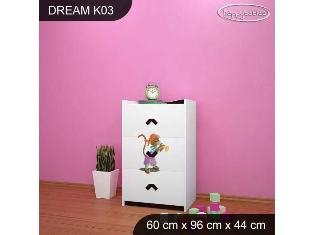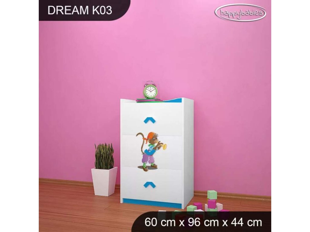 Dětské komody patří k základní výbavě každého pokojíčku. Komody jsou velmi praktické a můžeme je použít jak na oblečení pro děti, tak na hračky nebo knížky. Komoda obsahuje 3 šuplíky. Materiál: lamino 18 mm Barva: růžová, bílá, wenge, hruška, zelená, modrá Rozměr: 60 cm x 96 cm x 44 cm Ve stejném motivu si můžete zakoupit také skříň, regál, knihovnu, psací stůl, noční stolek, box na hračky nebo poličku.Buďte první, kdo napíše příspěvek k této položce.