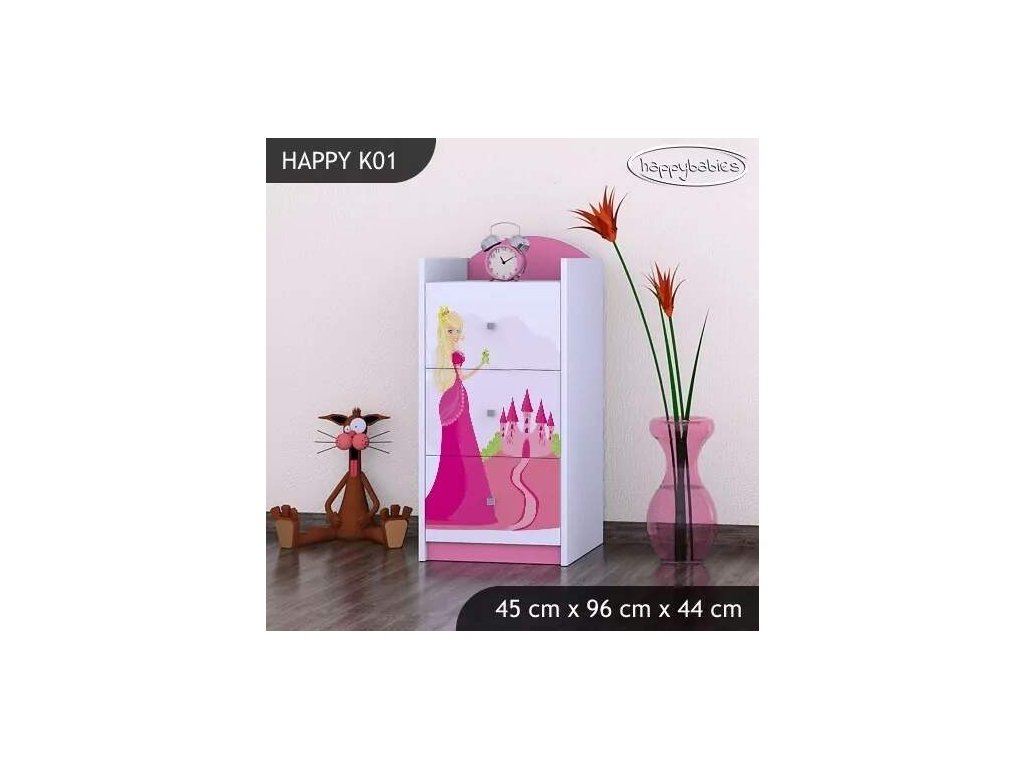 Dětské komody patří k základní výbavě každého pokojíčku. Komody jsou velmi praktické a můžeme je použít jak na oblečení pro děti, tak na hračky nebo knížky. Komoda obsahuje 3 šuplíky. Materiál: lamino 18 mm Barva: růžová, bílá, kaštan wenge, kalvados, buk, hruška, zelená, modrá, oranžová Rozměr: 45 cm x 96 cm x 44 cm Ve stejném motivu si můžete zakoupit také skříň, regál, knihovnu, psací stůl, noční stolek, box na hračky nebo poličku.Buďte první, kdo napíše příspěvek k této položce.