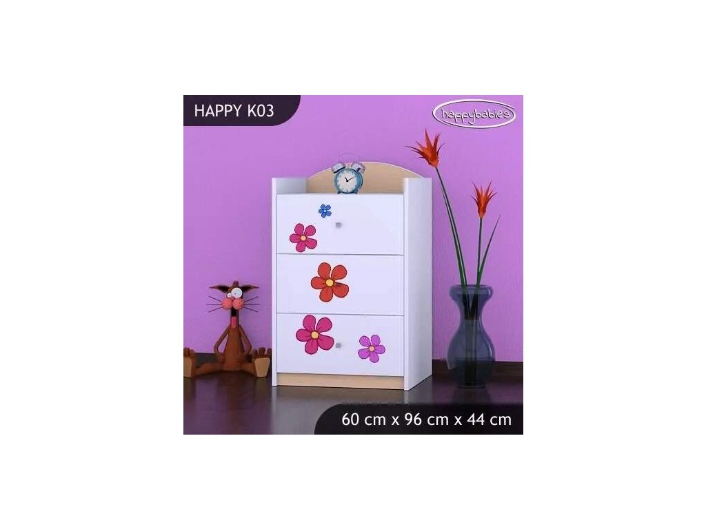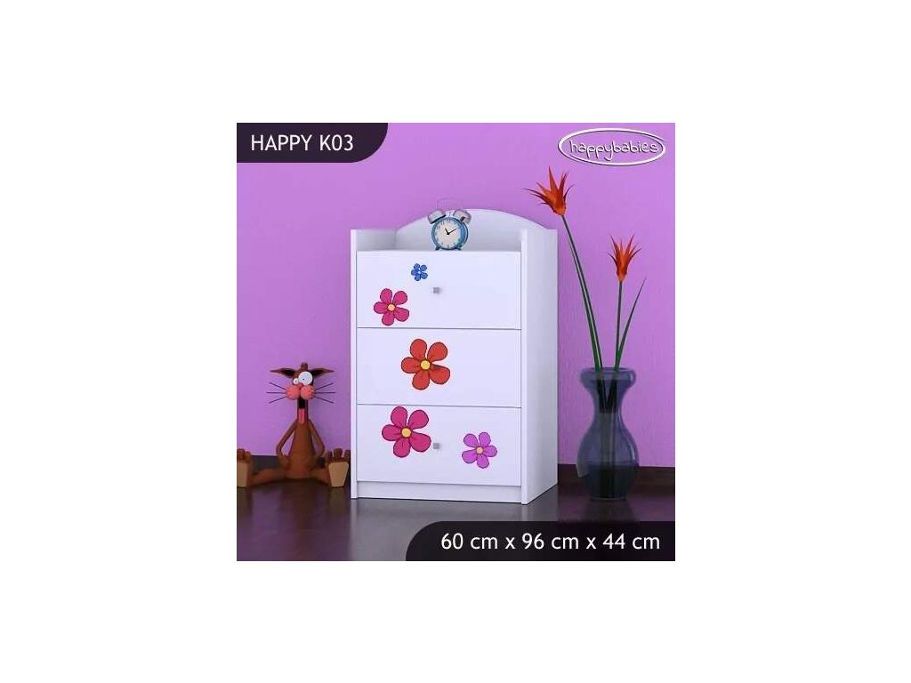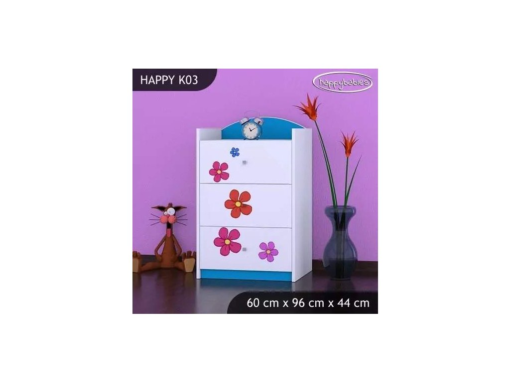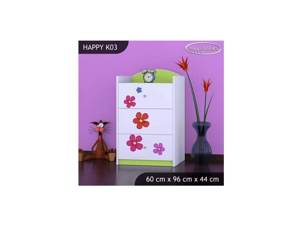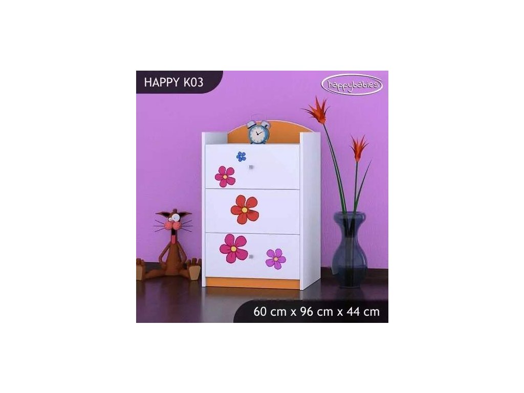 Dětské komody patří k základní výbavě každého pokojíčku. Komody jsou velmi praktické a můžeme je použít jak na oblečení pro děti, tak na hračky nebo knížky. Komoda obsahuje 3 šuplíky. Materiál: lamino 18 mm Barva: růžová, bílá, kaštan wenge, kalvados, buk, hruška, zelená, modrá, oranžová Rozměr: 60 cm x 96 cm x 44 cm Ve stejném motivu si můžete zakoupit také skříň, regál, knihovnu, psací stůl, noční stolek, box na hračky nebo poličku.Buďte první, kdo napíše příspěvek k této položce.