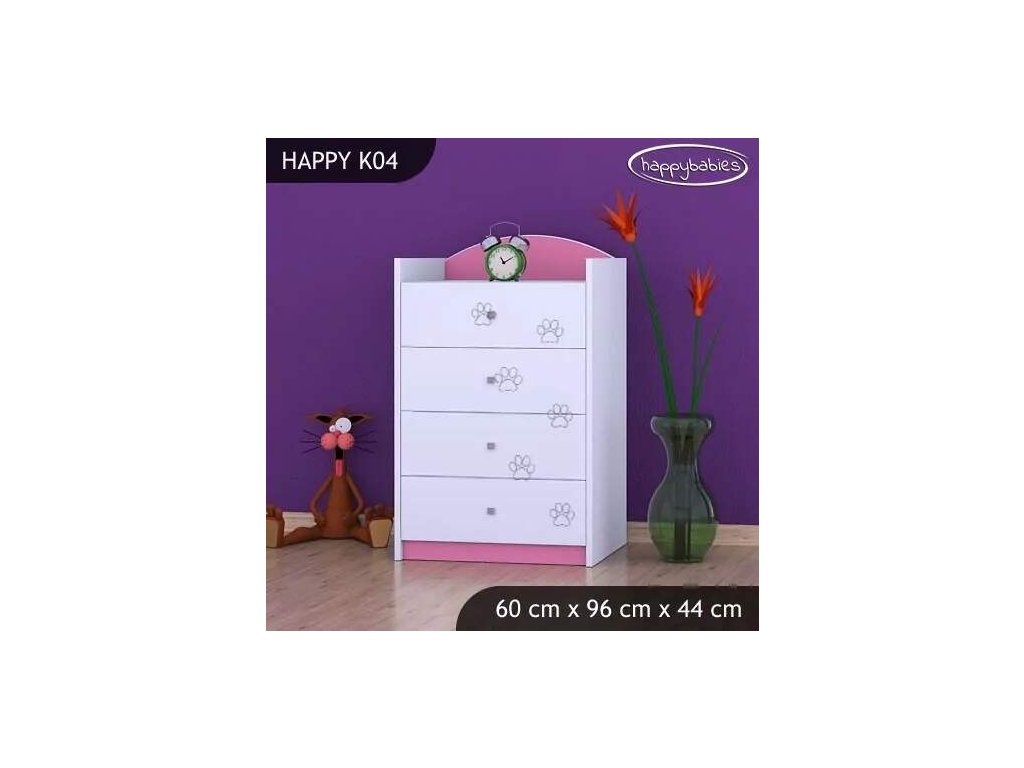 Dětské komody patří k základní výbavě každého pokojíčku. Komody jsou velmi praktické a můžeme je použít jak na oblečení pro děti, tak na hračky nebo knížky. Komoda obsahuje 4 šuplíky. Materiál: lamino 18 mm Barva: růžová, bílá, kaštan wenge, kalvados, buk, hruška, zelená, modrá, oranžová Rozměr: 60 cm x 96 cm x 44 cm Ve stejném motivu si můžete zakoupit také skříň, regál, knihovnu, psací stůl, noční stolek, box na hračky nebo poličku.Buďte první, kdo napíše příspěvek k této položce.
