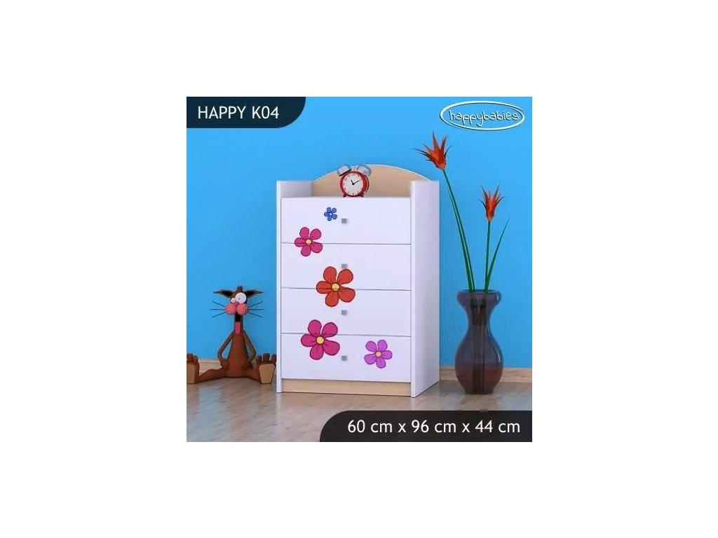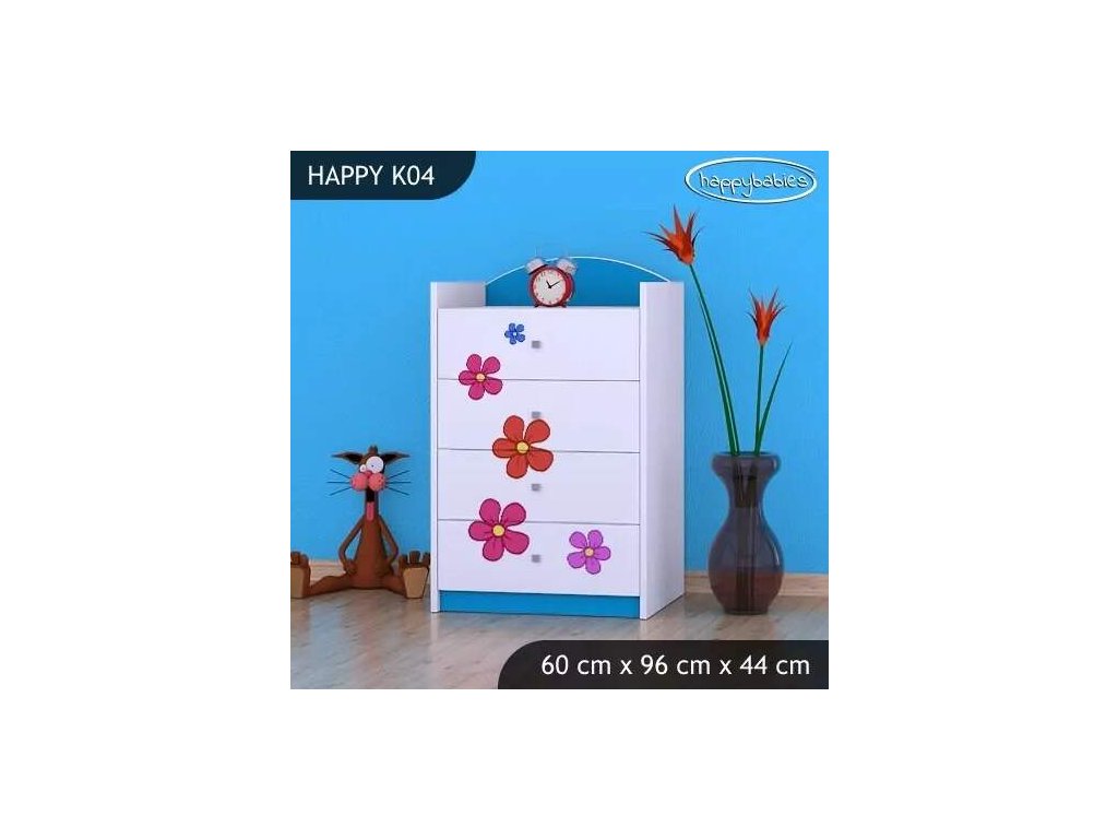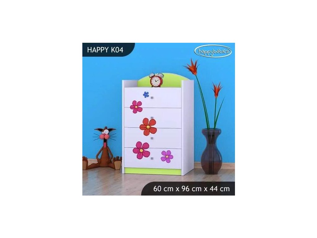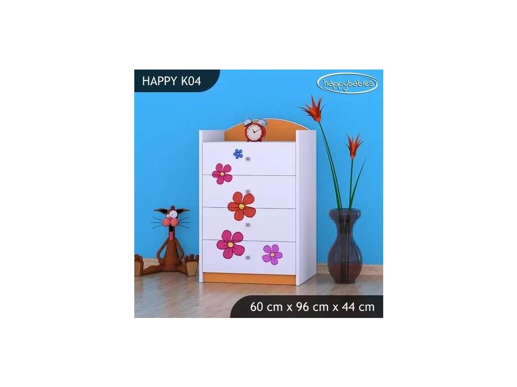 Dětské komody patří k základní výbavě každého pokojíčku. Komody jsou velmi praktické a můžeme je použít jak na oblečení pro děti, tak na hračky nebo knížky. Komoda obsahuje 4 šuplíky. Materiál: lamino 18 mm Barva: růžová, bílá, kaštan wenge, kalvados, buk, hruška, zelená, modrá, oranžová Rozměr: 60 cm x 96 cm x 44 cm Ve stejném motivu si můžete zakoupit také skříň, regál, knihovnu, psací stůl, noční stolek, box na hračky nebo poličku.Buďte první, kdo napíše příspěvek k této položce.