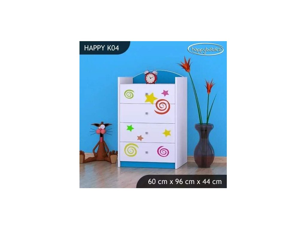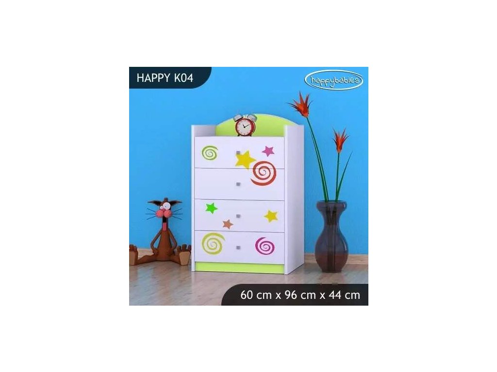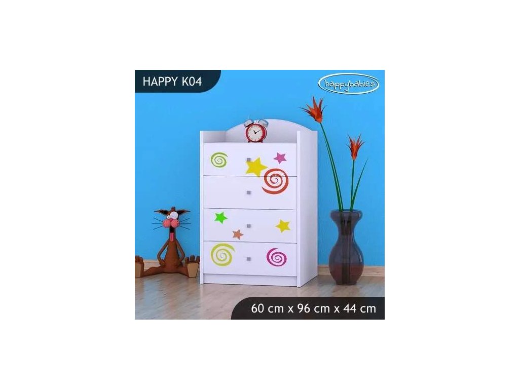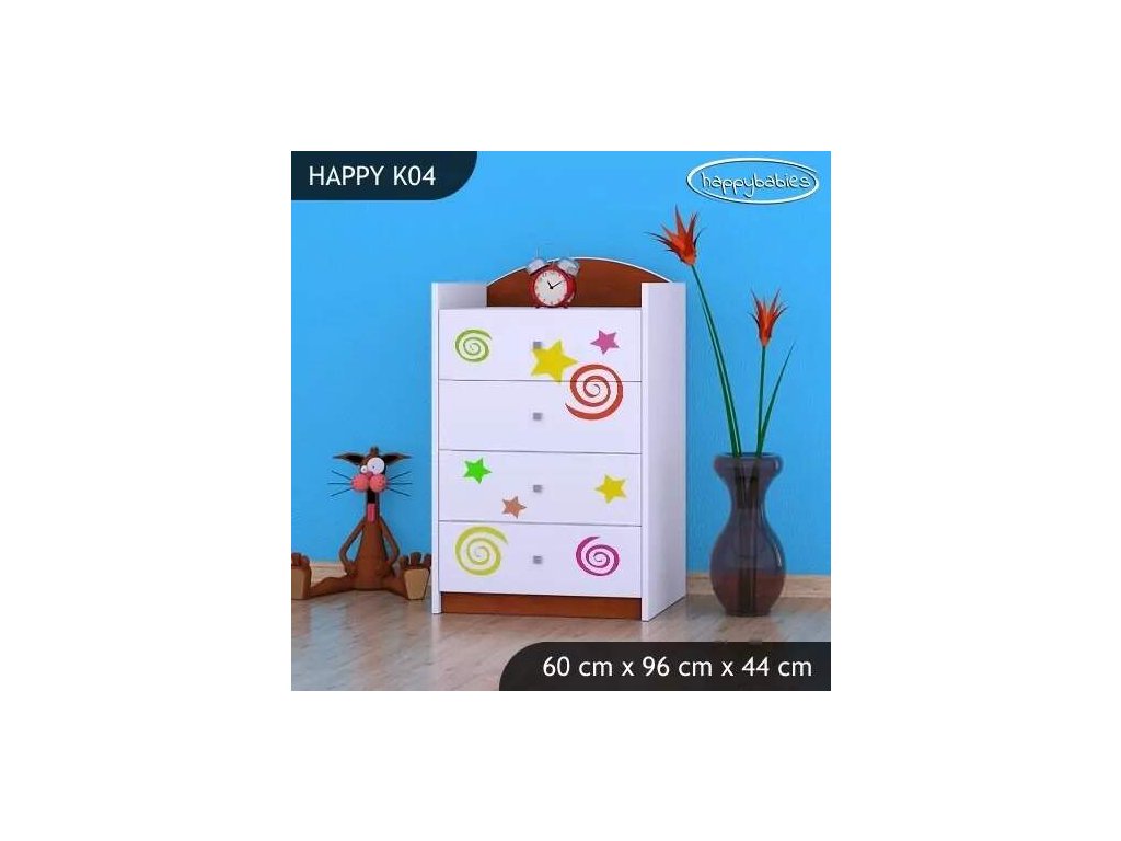 Dětské komody patří k základní výbavě každého pokojíčku. Komody jsou velmi praktické a můžeme je použít jak na oblečení pro děti, tak na hračky nebo knížky. Komoda obsahuje 4 šuplíky. Materiál: lamino 18 mm Barva: růžová, bílá, kaštan wenge, kalvados, buk, hruška, zelená, modrá, oranžová Rozměr: 60 cm x 96 cm x 44 cm Ve stejném motivu si můžete zakoupit také skříň, regál, knihovnu, psací stůl, noční stolek, box na hračky nebo poličku.Buďte první, kdo napíše příspěvek k této položce.