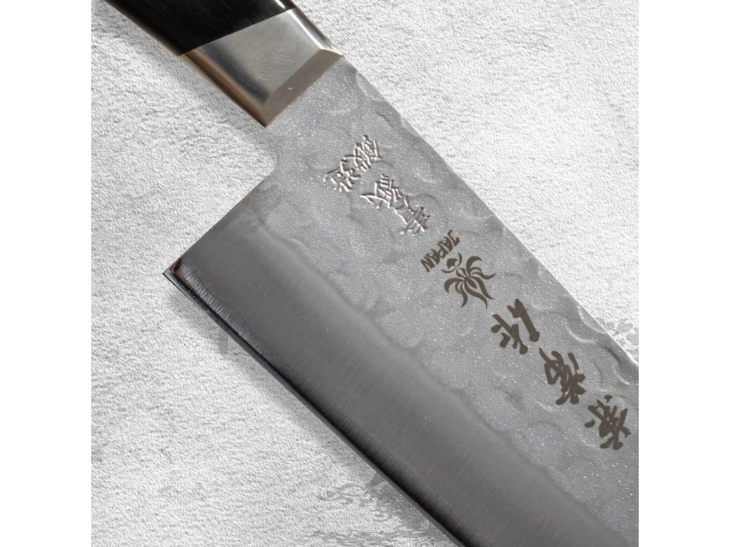 Čepel je vyrobena z vysoce ceněné Blue Steel (Aogami), uzavřené mezi dvěma vrstvami nerezové oceli SUS410, což zajišťuje výjimečnou tvrdost (61–62 HRC), skvělou ostrost i snadnější údržbu. Díky ručně tepanému povrchu Tsuchime se krájené suroviny nelepí na čepel, což zrychluje a zpříjemňuje práci.