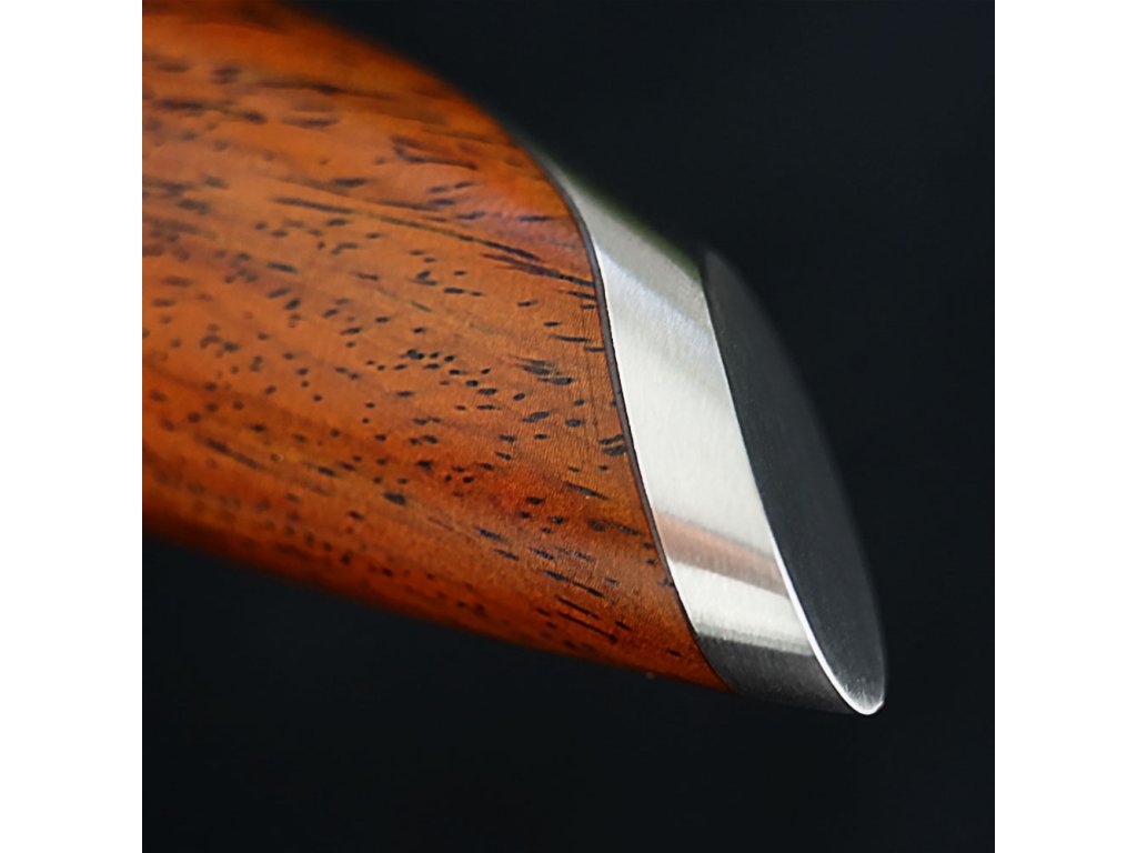 Rukojeť ve stylu western je vyrobena z luxusního rosewoodu (palisandru), který je oblíbený pro svou trvanlivost, teplou kresbu a odolnost vůči vlhkosti. Díky ergonomickému tvaru a ozdobnému nýtu sedí nůž perfektně v ruce a poskytuje stabilitu i při delší práci. Tento materiál je nejen praktický, ale také krásný – dodá vaší kuchyni nádech elegance.