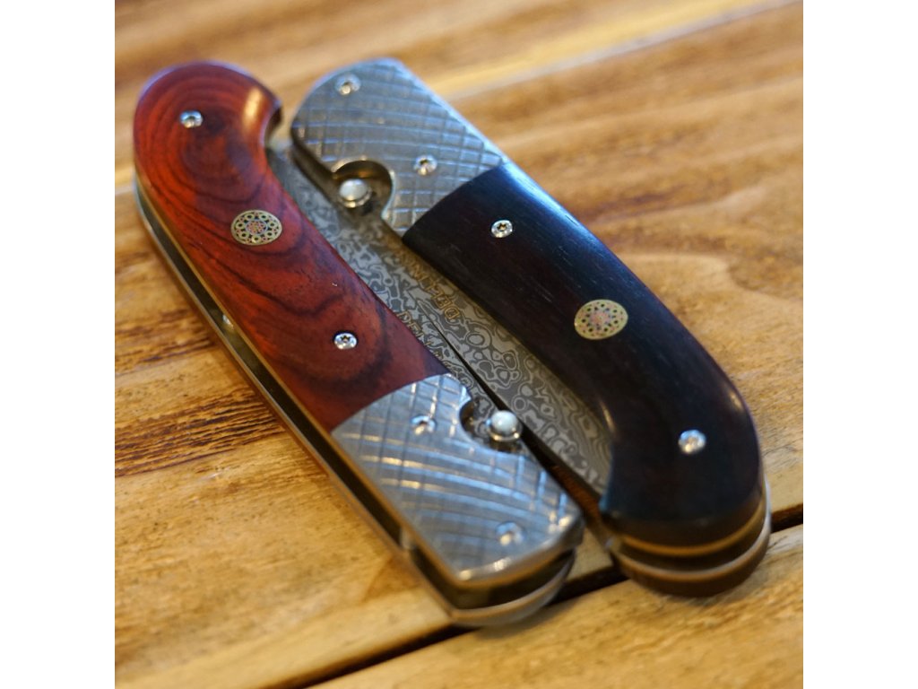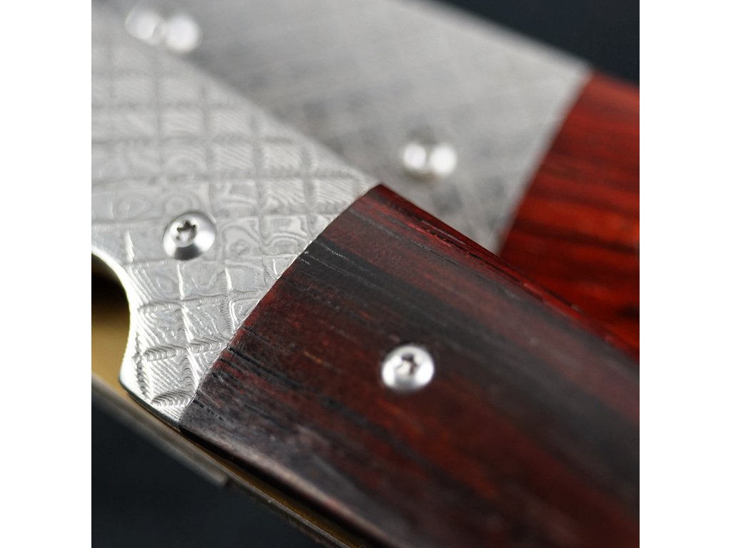 Materiály: Čepele jsou vyrobeny z damaškové oceli VG10, která je známá svou odolností vůči korozi a vysokou tvrdostí. Rukojeť je z dřeva palisandru (SISSO WOOD) s doplňkovým nerezovým damaškovým žebrovaným bolstrem.