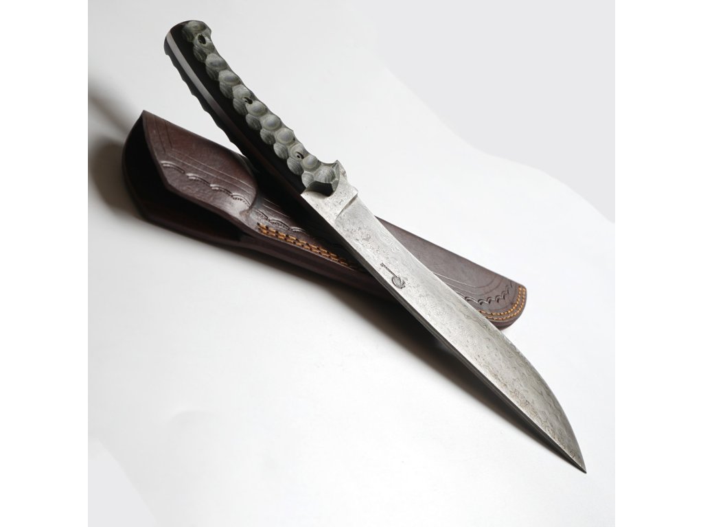 - Materiál: Mačeta je vyrobena z 352 vrstev damascénské oceli, kombinující vysoký obsah uhlíku 1095 a odolnost 15n20. Vysoký obsah uhlíku dává ostří extrémní ostrost a trvanlivost, přičemž uhlíkové oceli jsou snazší na ostření než nerezové oceli. Postupem času získá váš nůž krásnou patinu, která přidá na jeho unikátnosti.
