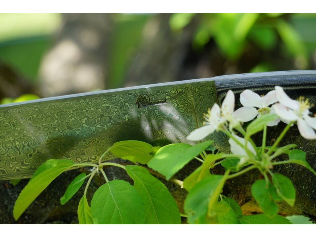 - Údržba: Každý nůž je vyroben z přírodních materiálů, takže se může mírně lišit od fotografií. Pro zachování jeho vzhledu a funkčnosti opláchněte nůž po každém použití, osušte hadříkem a uložte na suchém místě. Nikdy nepoužívejte myčku na nádobí – damascénská ocel není nerezová a vyžaduje speciální péči.