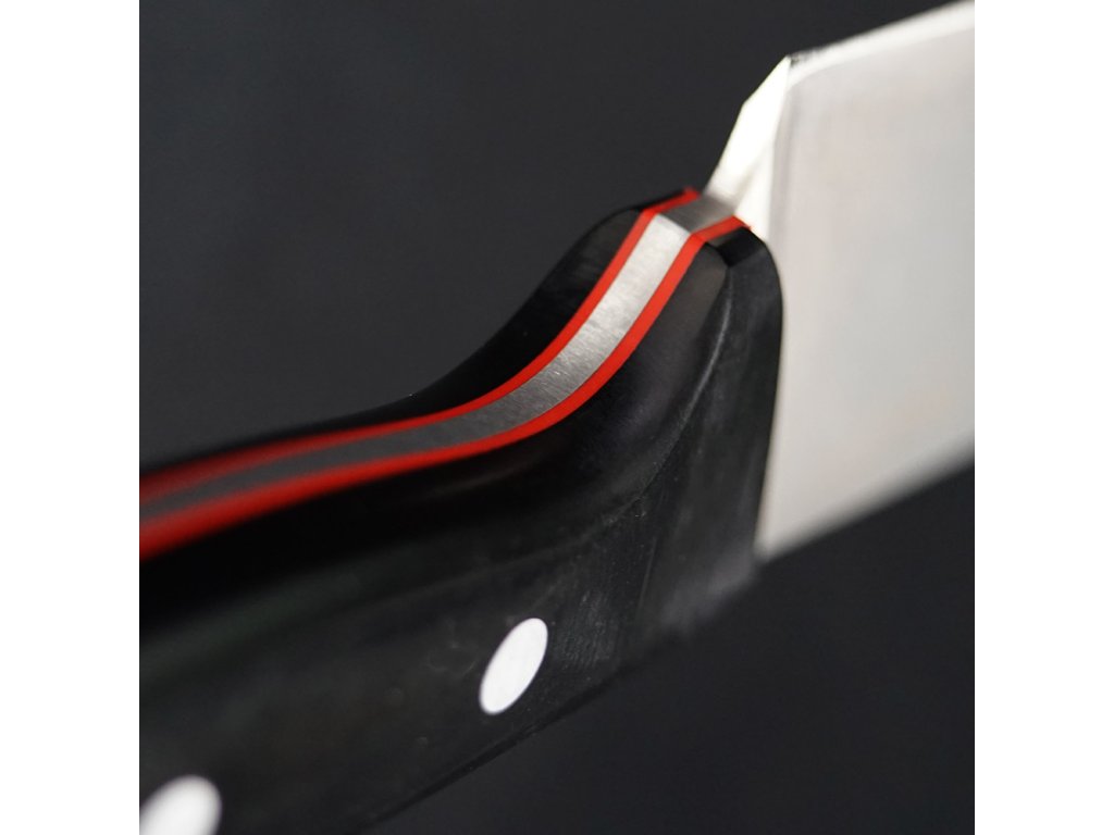 Rukojeť je vyrobena z odolného černého kompozitu s červenými příložkami, který spojuje elegantní vzhled s maximální funkčností. Materiál odolá nárazům, vlhkosti i tukům a poskytuje pevný a hygienický úchop i při delší práci.