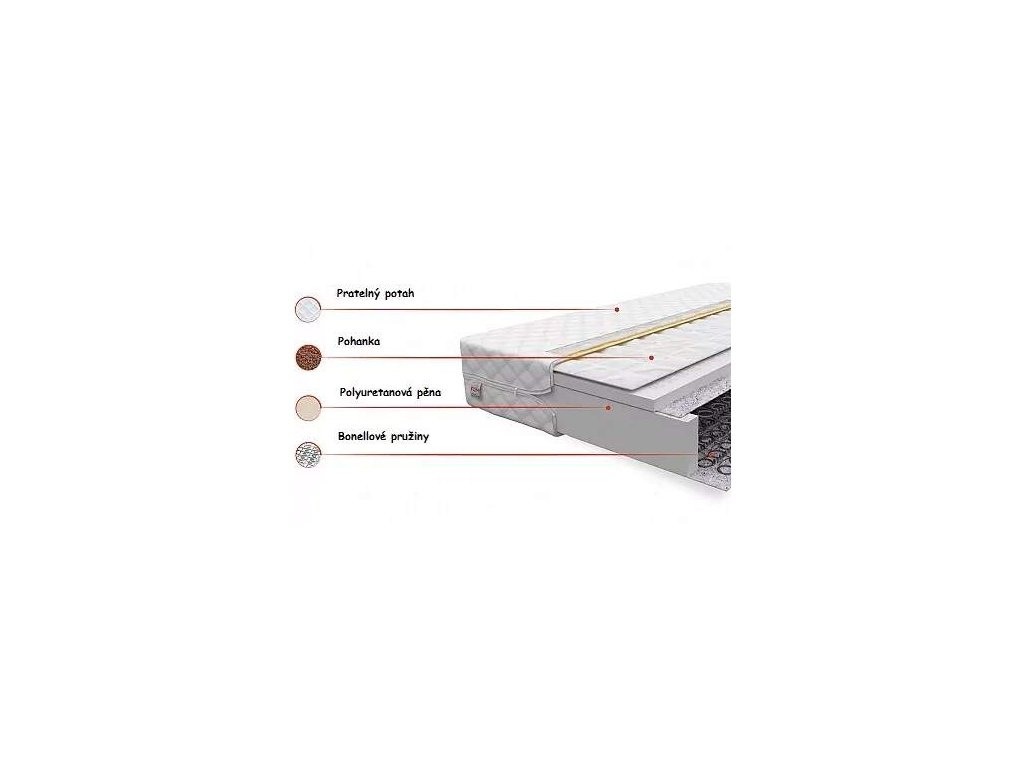 Tato matrace se charakterizuje velkou flexibilitou, díky čemu je vhodná i pro lidi s větší váhou. V matraci je použita polyuretanová pěna, která má vysokou odolnost proti deformaci a nabízí tak za příznivou cenu velké pohodlí a dlouhou životnost. Zajišťuje dostatečné tlumení, má vzdušnou strukturu, je flexibilní a pružná. Matrace obsahuje vysoce kvalitní antialergický potah, který je snímatelný a pratelný. Pohanková vrstva je tvořena skořápkami se zrníček pohanky všitých do polyuretanové prodyšné látky sešité do jednotlivých polštářků, aby nedocházelo k přesouvání skořápek. Jedná se o přírodní materiál. Výhodou pohanky je to, že se díky obsahu taninů nedostávají do matrace roztoči ani různé bakterie. Proto je tato matrace vhodná hlavně pro alergiky. Jsou vhodné i pro lidi připoutané na lůžko, jelikož chrání před proleženinami. Také zlepšují prokrvení, posilují imunitu a přináší úlevu při různých revmatických potížích.V našich matracích je použit inovativní systém lepení HotMelt. Tavné lepidlo odstraňuje všechny těkavé látky, které jsou ve výrobním procesu a je bez zápachu. Výška matrace: 13 cm Tvrdost: H3 - střední tvrdostBuďte první, kdo napíše příspěvek k této položce.