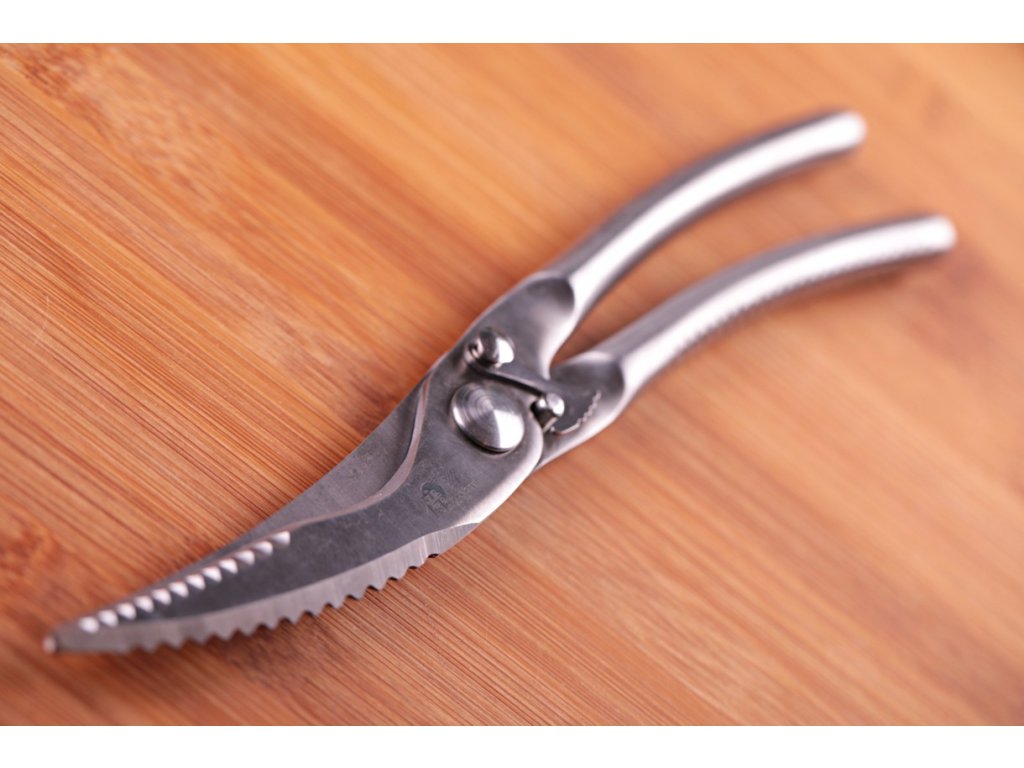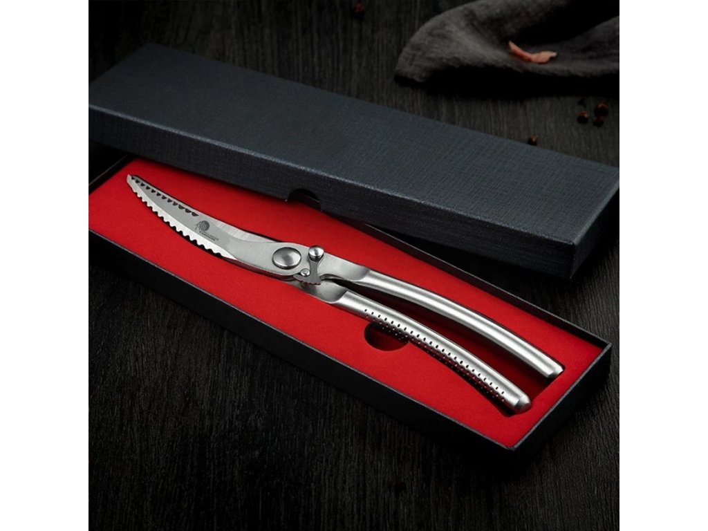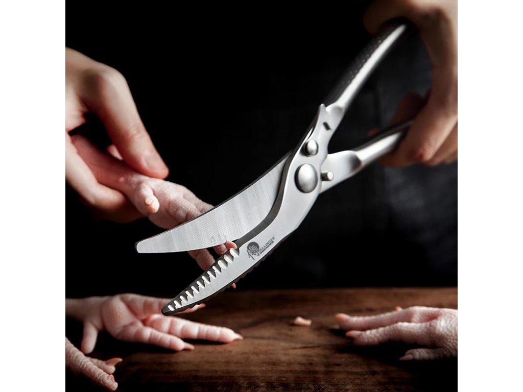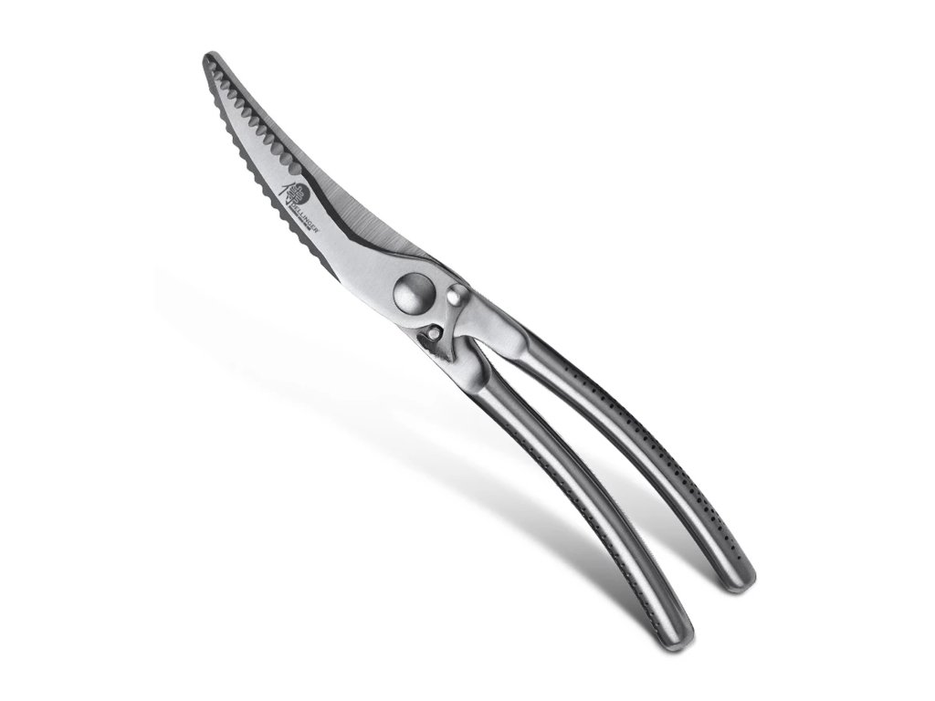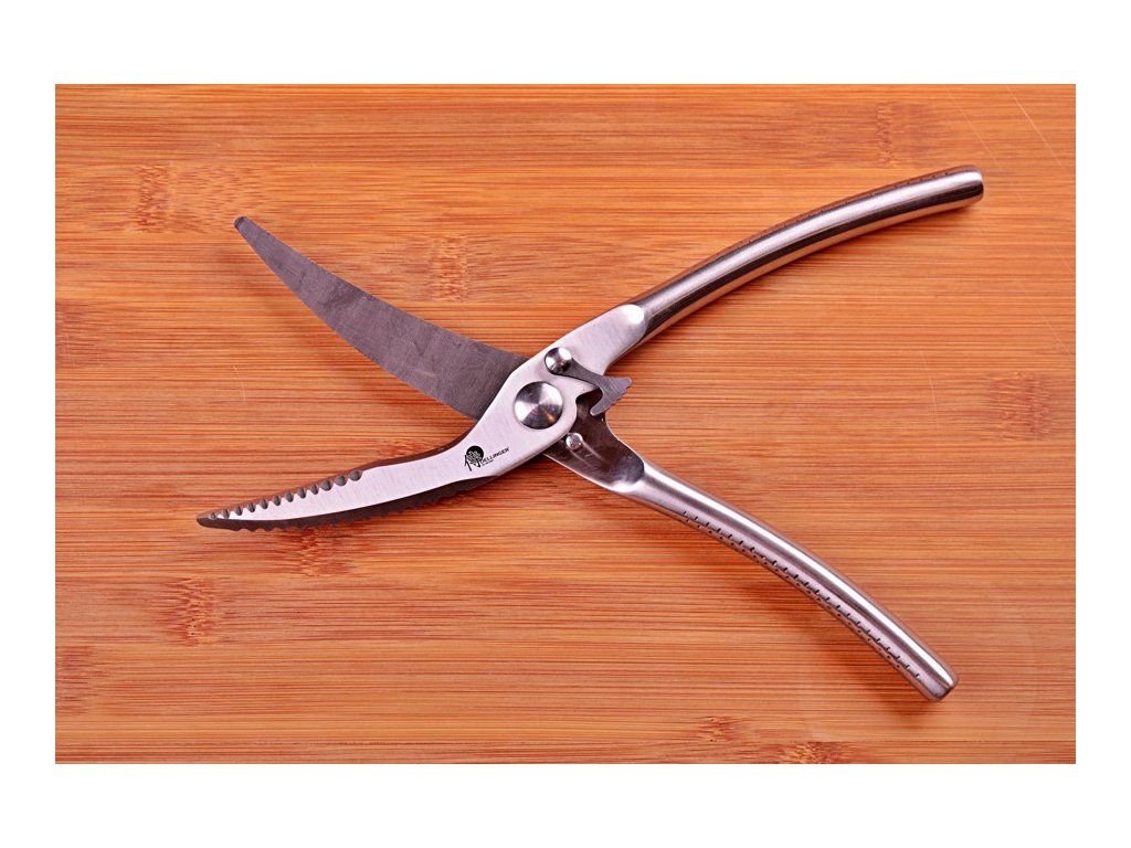 Masivní nůžky na drůbež Dellinger se speciálně tvarovaným a broušeným multifunkčním ostřím. Ideální pro snadné porcování kůže, hluboce mraženého masa, ryb i silných drůbežích kostí. Nůžky jsou vyrobeny z prvotřídní nerezavějící oceli 4Cr14N a jsou opatřeny ergonomickou rukojetí a bezpečnostní pojistkou.