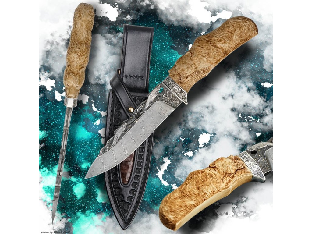 Jedinečný nůž "Bear Sign Engraved" čepel ze švédské damaškové oceli SANDVIK 19C27+440C+1095 mosaic pattern. Rukojeť z paroží jelena s ručně rytým vyobrazením medvěda. Nepřehlédnutelný vzor damaškové oceli s rytinami lososů v peřejích a ručně ryté rukojeti tvoří perfektní a jedinečný pár. Konečný výsledek je naprosto dechberoucí a bezpochyby se jedná o vyjímečné umělecké dílo.