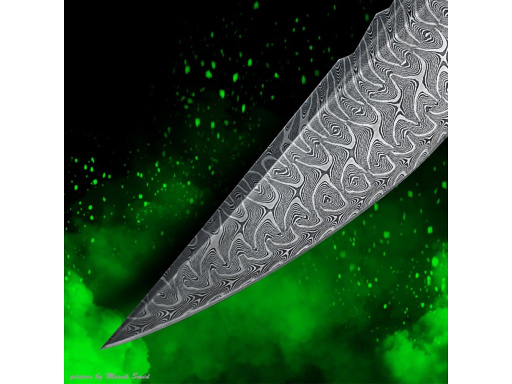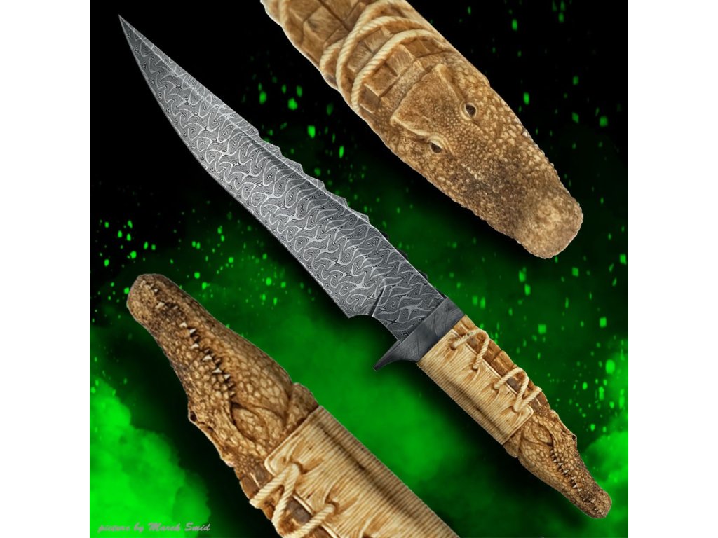 Jedinečný nůž "Crocodille Sign Engraved" čepel ze švédské damaškové oceli SANDVIK 19C27+440C+1095 mosaic pattern. Rukojeť z paroží jelena s ručně rytým vyobrazením krokodýla. Nepřehlédnutelný vzor damaškové oceli a ručně ryté rukojeti tvoří perfektní pár a konečný výsledek je naprosto uchvacující. Tento nůž je ručně vyrobený a tím pádem jedinečný a originální.