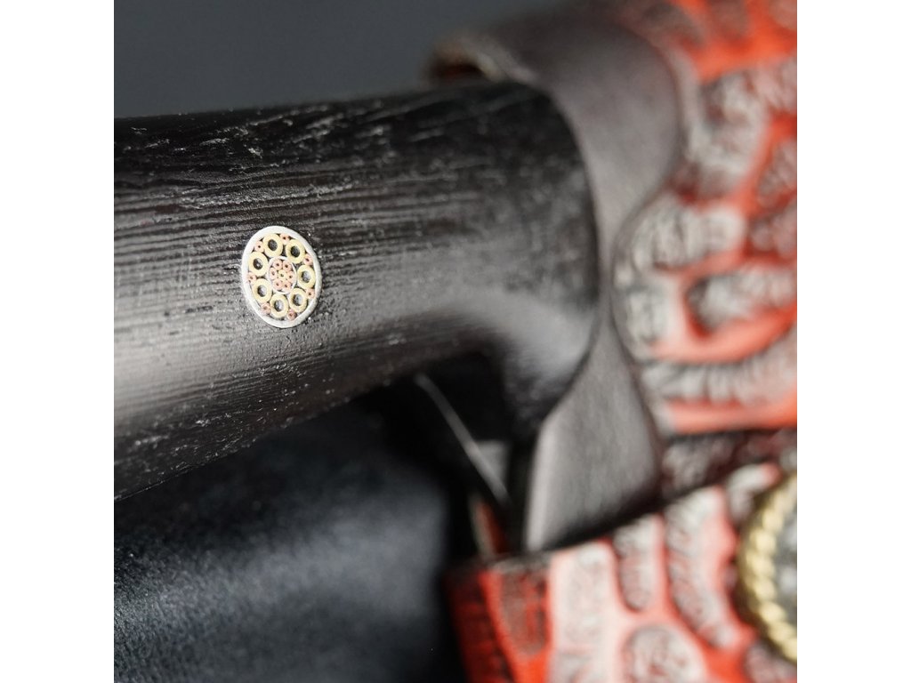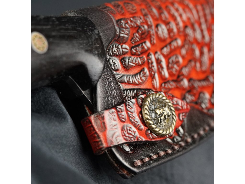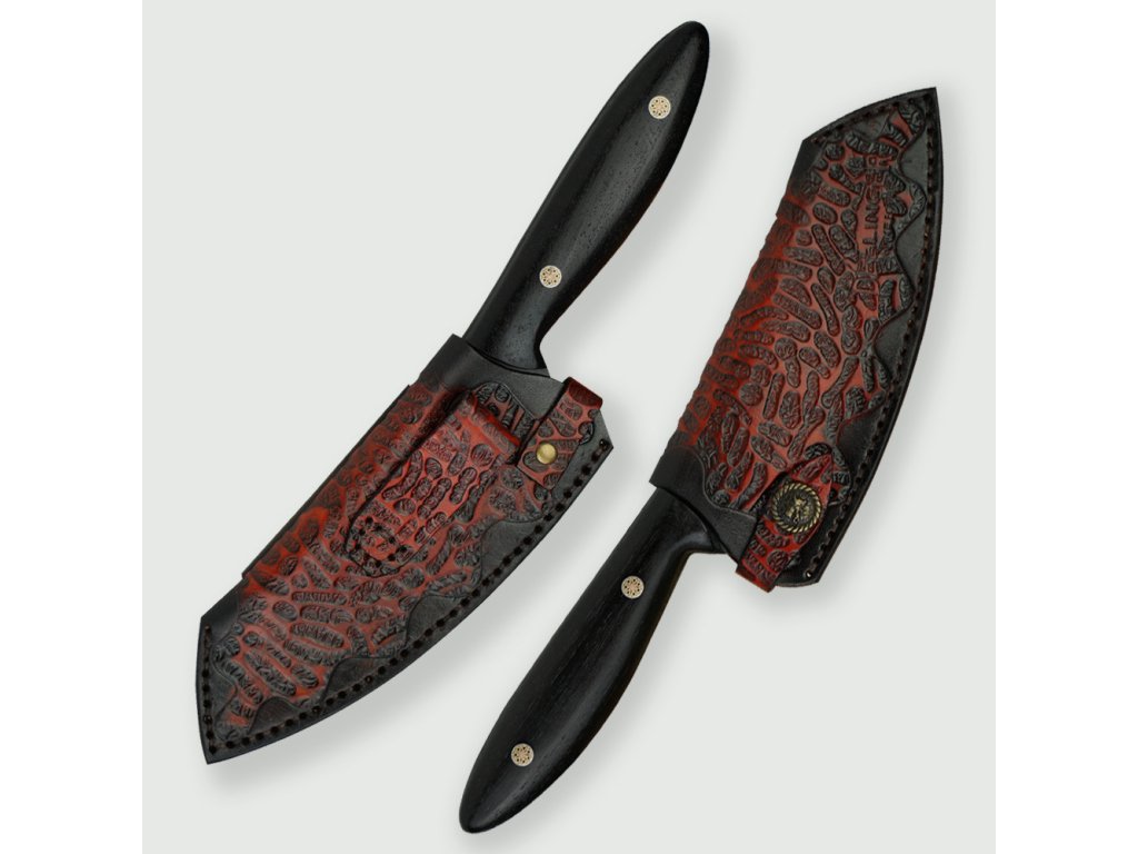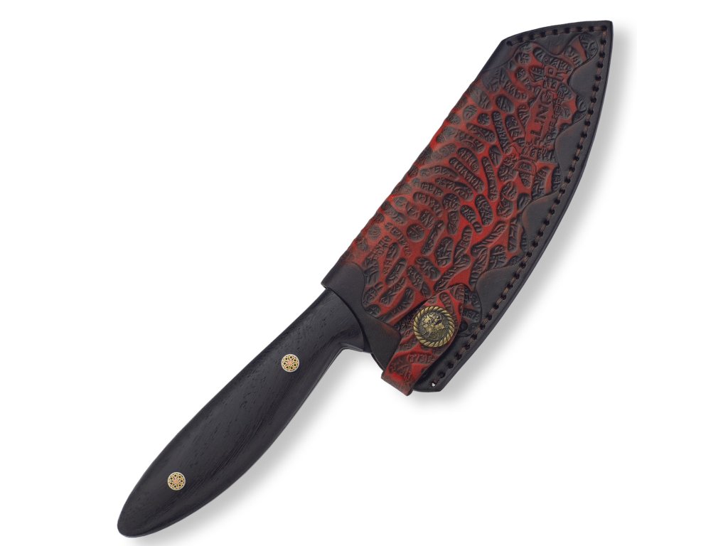 - Rukojeť: Rukojeť je z kvalitního kartáčovaného dřeva Wenge, které je ceněno pro svou krásu a pevnost. Rukojeť je ergonomicky tvarovaná, pečlivě ručně leštěná a ozdobena dvěma okrasnými nýty, což zajišťuje pohodlné a bezpečné uchopení.