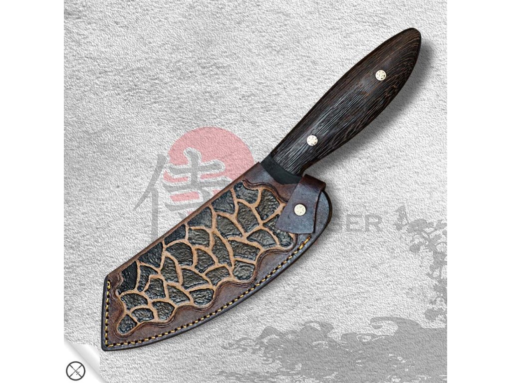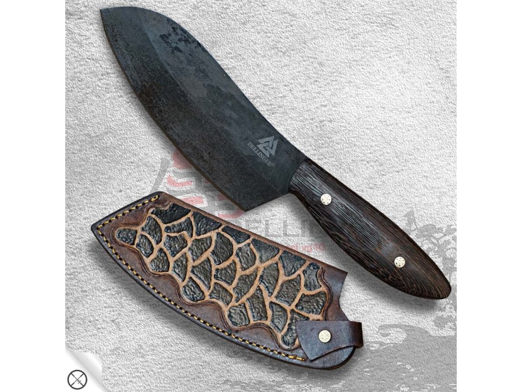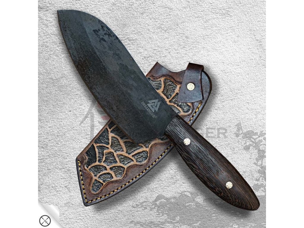 Kuchyňský outdoorový nůž s rukojetí z exotického kartáčovaného dřeva Wenge. Tento kuchařský nůž, vhodný pro BBQ, je ručně kovaný a zpracovaný z nástrojové oceli D2. Po přesném a pečlivém kalení dosahuje tvrdosti okolo 60-62 HRC, což zajišťuje, že jeho ostří jen tak něco nepoškodí. Pro krájení a sekání zeleniny, masa a kostí je to klíčový nástroj, bez kterého se už nikdy neobejdete. Budete chtít ukázat každé návštěvě, jaký kus překrásného železa se skrývá ve vaší kuchyni! Nádherná rukojeť tohoto nože je ručně tvarována z kusu exotického dřeva Wenge a je doplněna dvěma okrasnými nýty. Povrch čepele je surový a neopracovaný - je to nůž s puncem tvrďáka.
