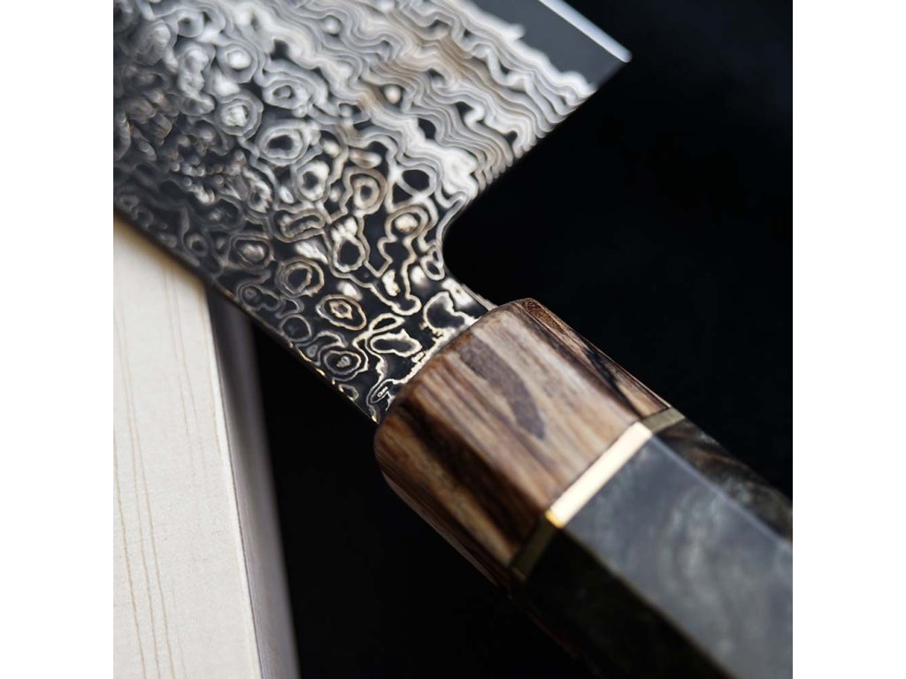 Nůž Gyuto / Chef 200 mm Suncraft Dawn Limited Editition má ostří z japonské práškové oceli SG2, která vyniká svou tvrdostí a schopností udržet ostří nože. Čepel nože je tvořena jádrem z práškové oceli SG2 o tvrdosti 63+/-1 Rockwella, které je vloženo mezi 110 vrstev dvou nerezových ocelí rozdílných tvrdostí, které zajišťují mimořádnou odolnost a houževnatost. Vzor vzniklý propletením vrstev oceli vytváří téměř jedinečný efekt, který Vás naprosto uchvátí. Tento vzor také minimalizuje tření při řezu a zabraňuje přilepení krájeného materiálu k čepeli. Díky citlivé volbě materiálu a precizní finální úpravě (black coating) se čepel snadno udržuje. Velmi dlouho si zachovává ostrost a výborně se hodí k broušení na vodních kamenech.