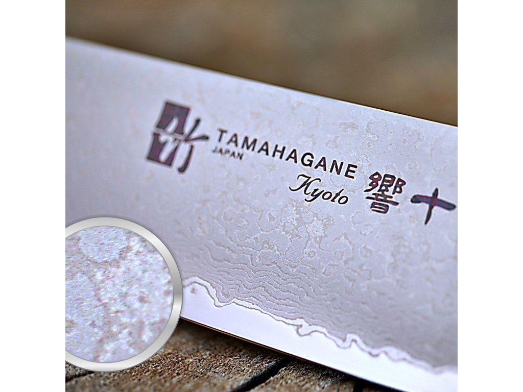 Série nerezových nožů Tamahagane VG-5 Bamboo Damascus - Kyoto, které vynikají kvalitním zpracováním a extrémní ostrostí. Jádro z japonské práškové oceli VG-5 je velmi odolné a zajišťuje dlouhou ostrost nože i v profesionální kuchyni. Jedinečný design vás ohromí propracovanými detaily a neotřelým designem. Jádro nože z japonské práškové oceli VG-5 je z uhlíkové molybden vanadiové oceli, které je z obou stran obaleno 31 vrstvami damaškové oceli SUS410 (13 Chrome Stainless Steel) z měkké a tvrdé nerezové oceli. Prášková ocel VG-5 obsahuje velké % uhlíku a má bezprecedentní tvrdost přibližně 61 Rockwella.