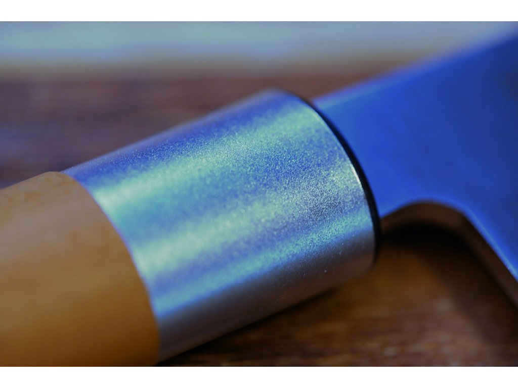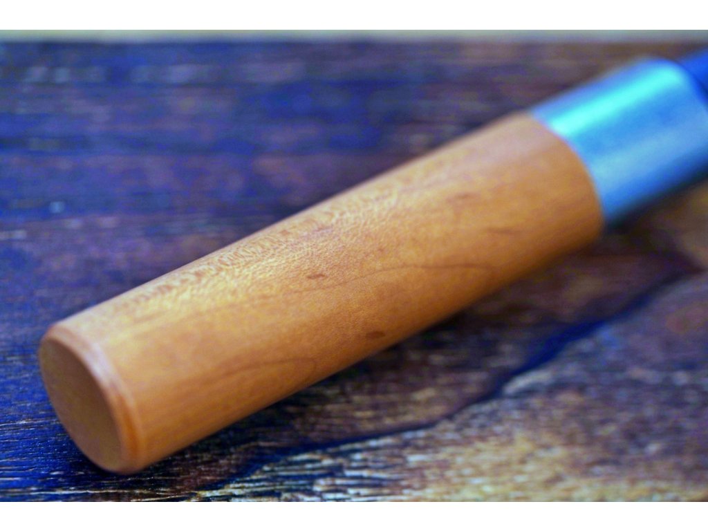 - Čepel: Vyrobena z molybdenvanadiové oceli, která je známá svou vynikající tvrdostí a odolností proti opotřebení. Tato ocel je ceněna pro svou schopnost udržet ostrost a odolávat korozi. Jednostranné broušení čepele je typické pro japonské nože Deba a zajišťuje čisté a přesné řezy.