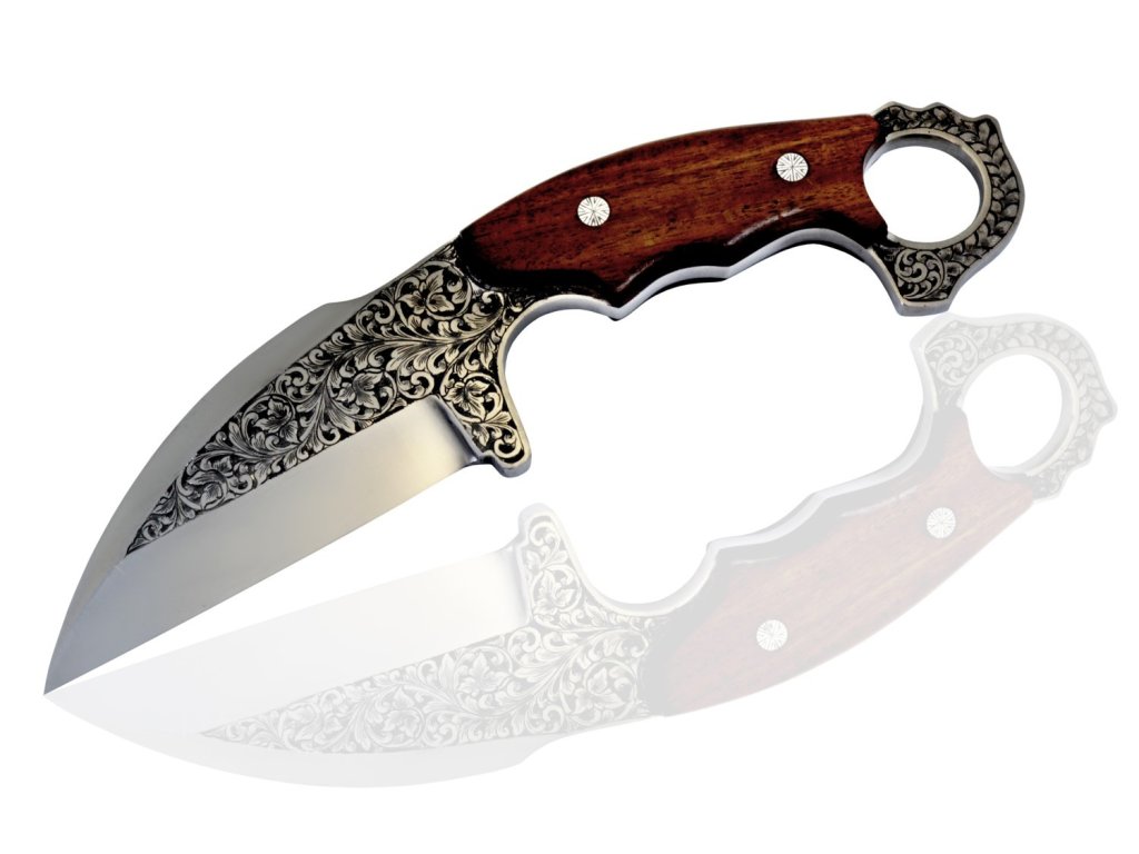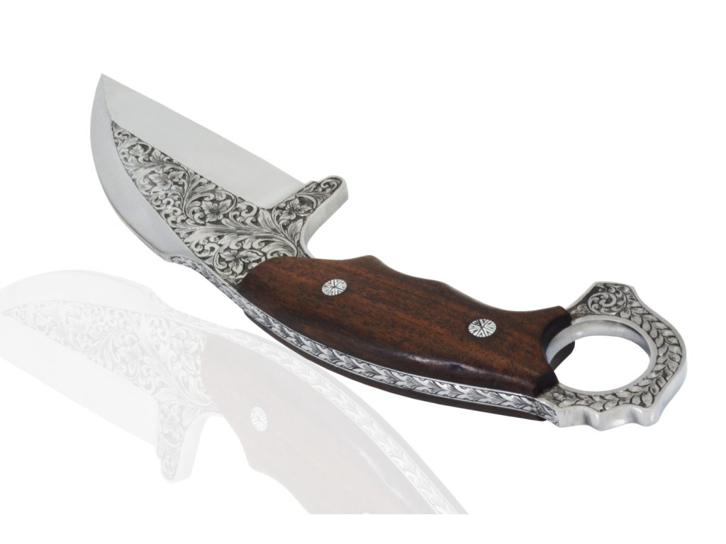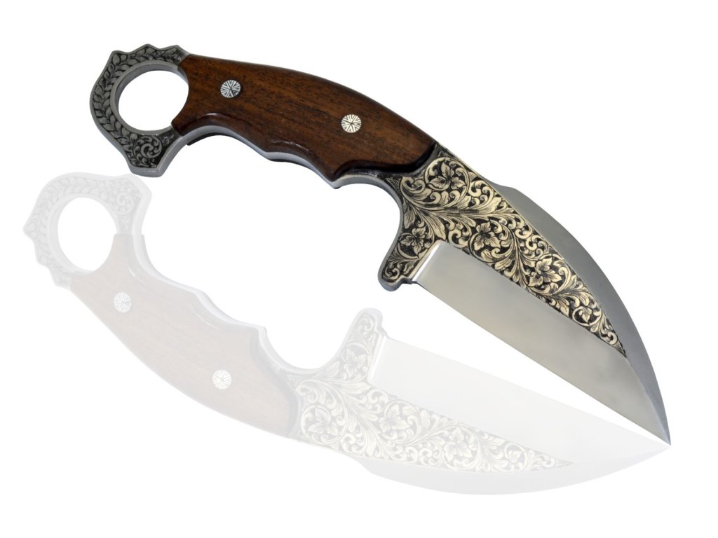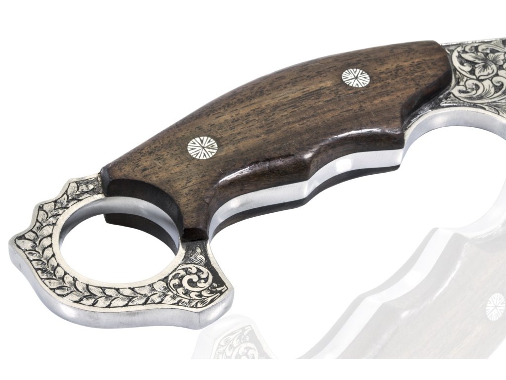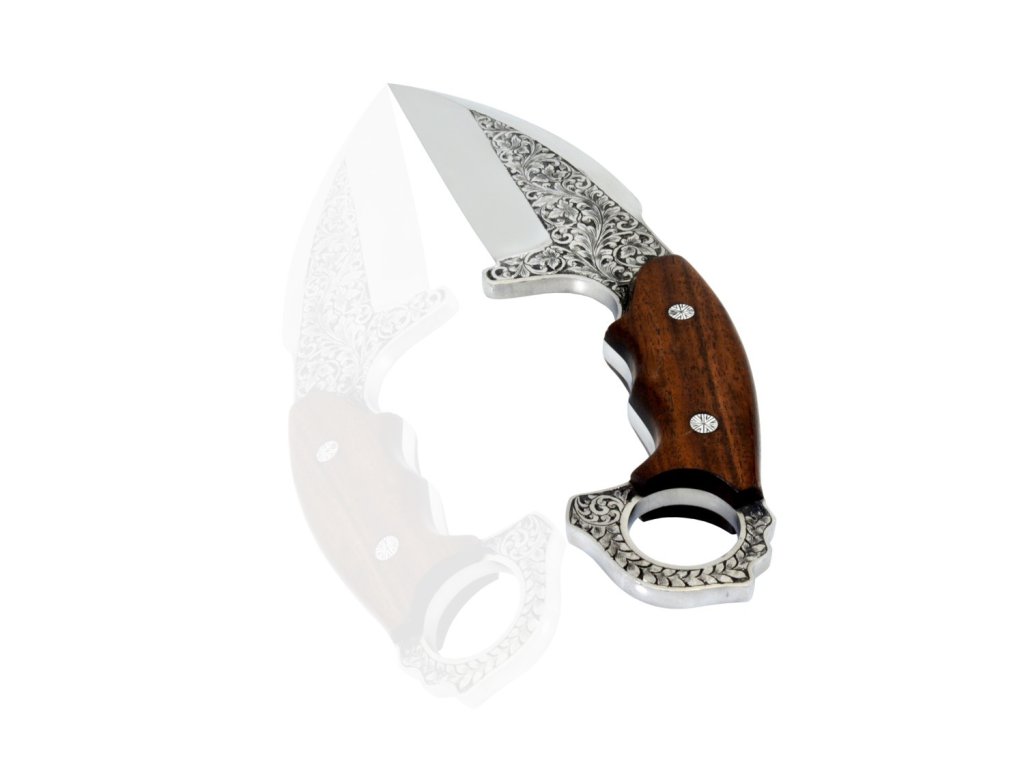 Nůž Dellinger "D2" Engraver Karambit je exkluzivní lovecký nůž s pevnou čepelí vyrobenou z oceli D2 a rukojetí z dřeva Palisandru. Tento nůž je ručně kovaný a zpracovaný s důrazem na vysokou tvrdost a trvanlivost. Zde jsou klíčové informace o tomto noži: