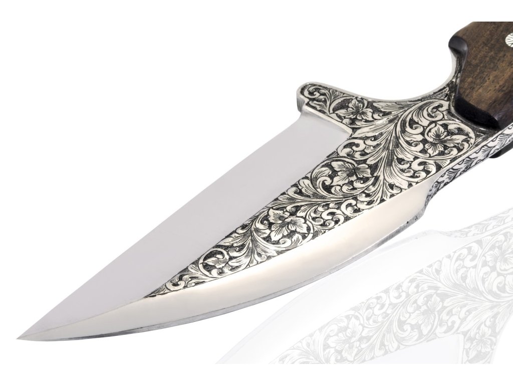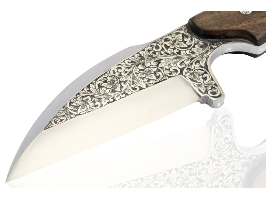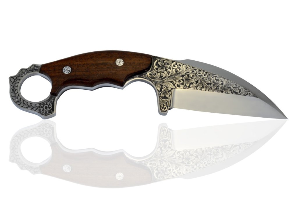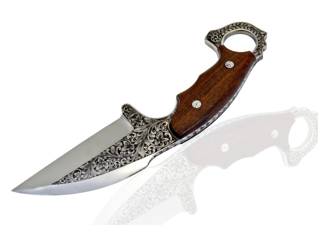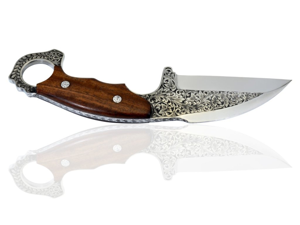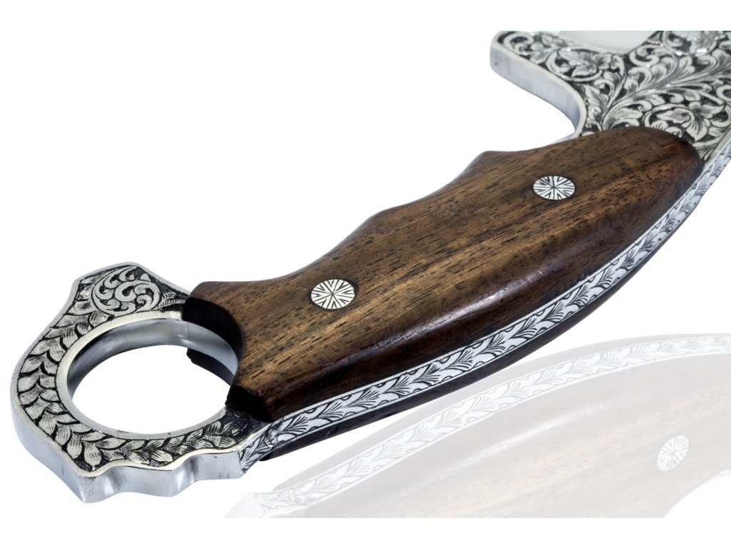 Nůž Dellinger "D2" Engraver Karambit je exkluzivní lovecký nůž s pevnou čepelí vyrobenou z oceli D2 a rukojetí z dřeva Palisandru. Tento nůž je ručně kovaný a zpracovaný s důrazem na vysokou tvrdost a trvanlivost. Zde jsou klíčové informace o tomto noži:
