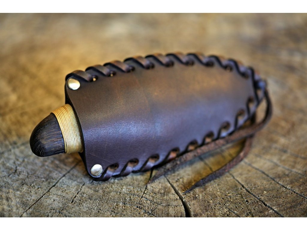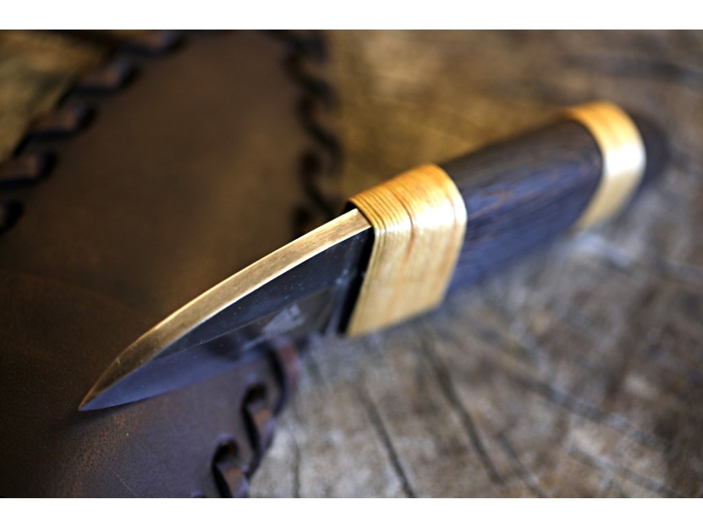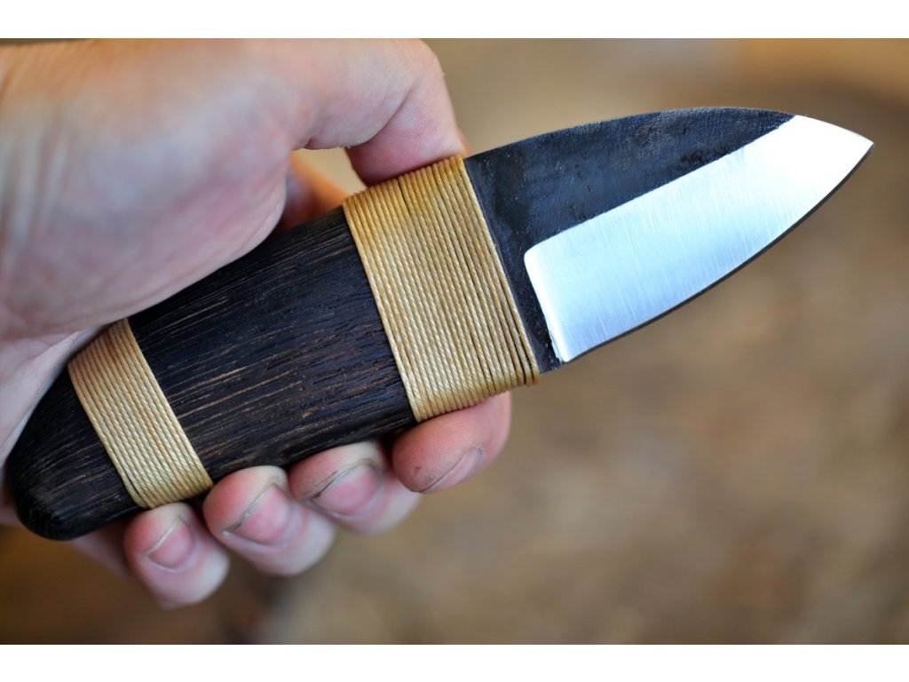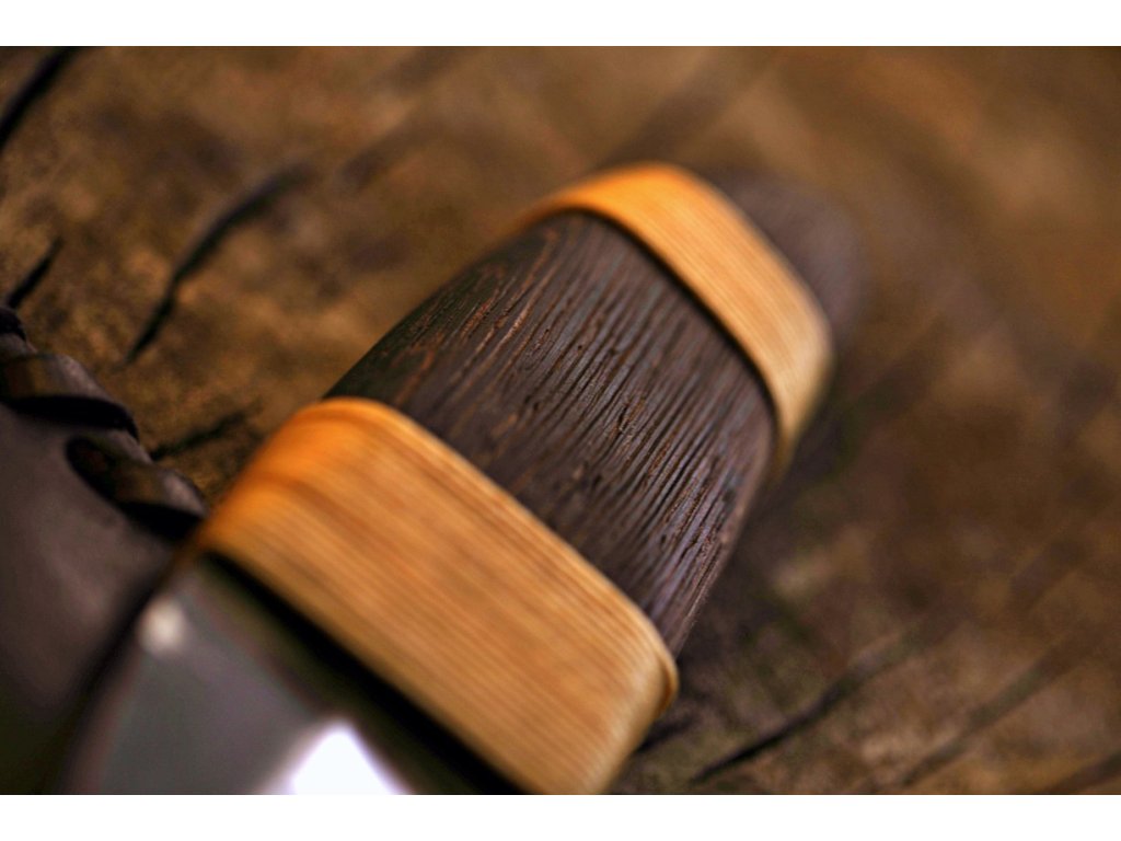 Rukojeť: Rukojeť je vyrobena z exotického dřeva Wenge, které poskytuje příjemný a esteticky působivý úchop. Pro lepší manipulaci je kolem rukojeti navlečen konopný provaz.