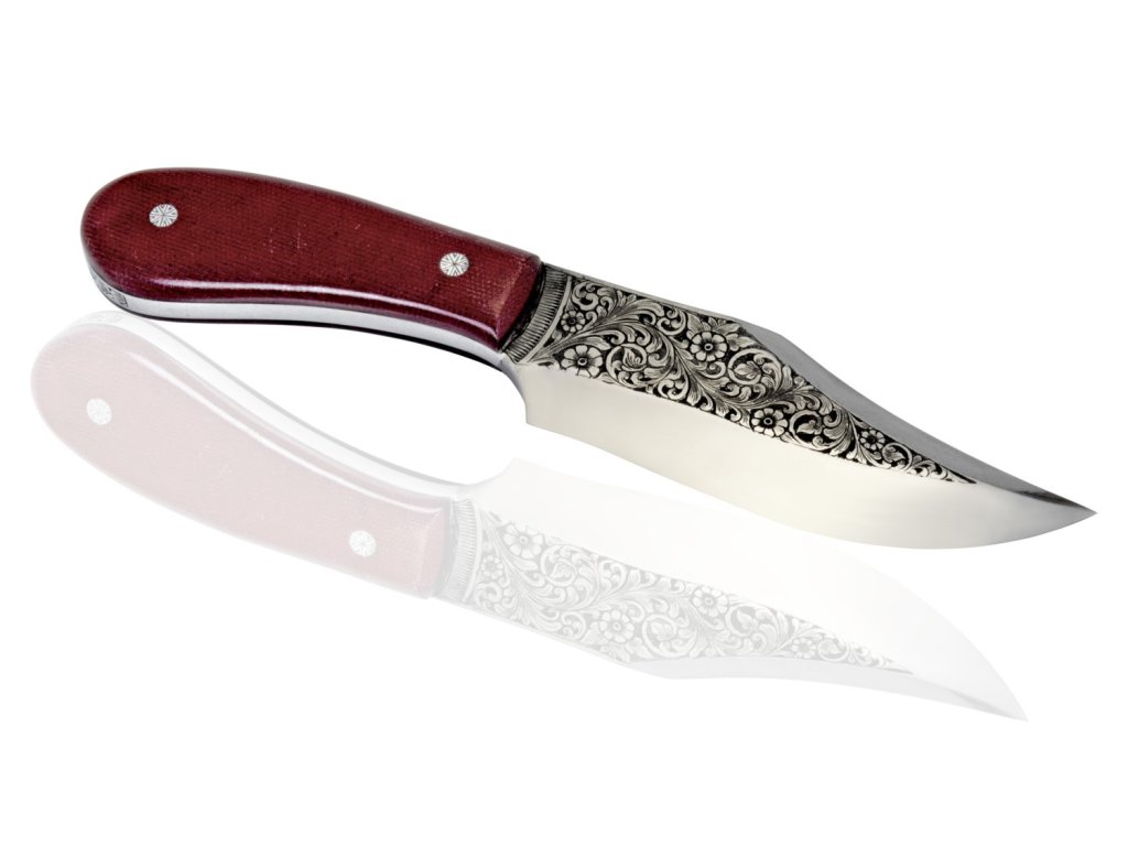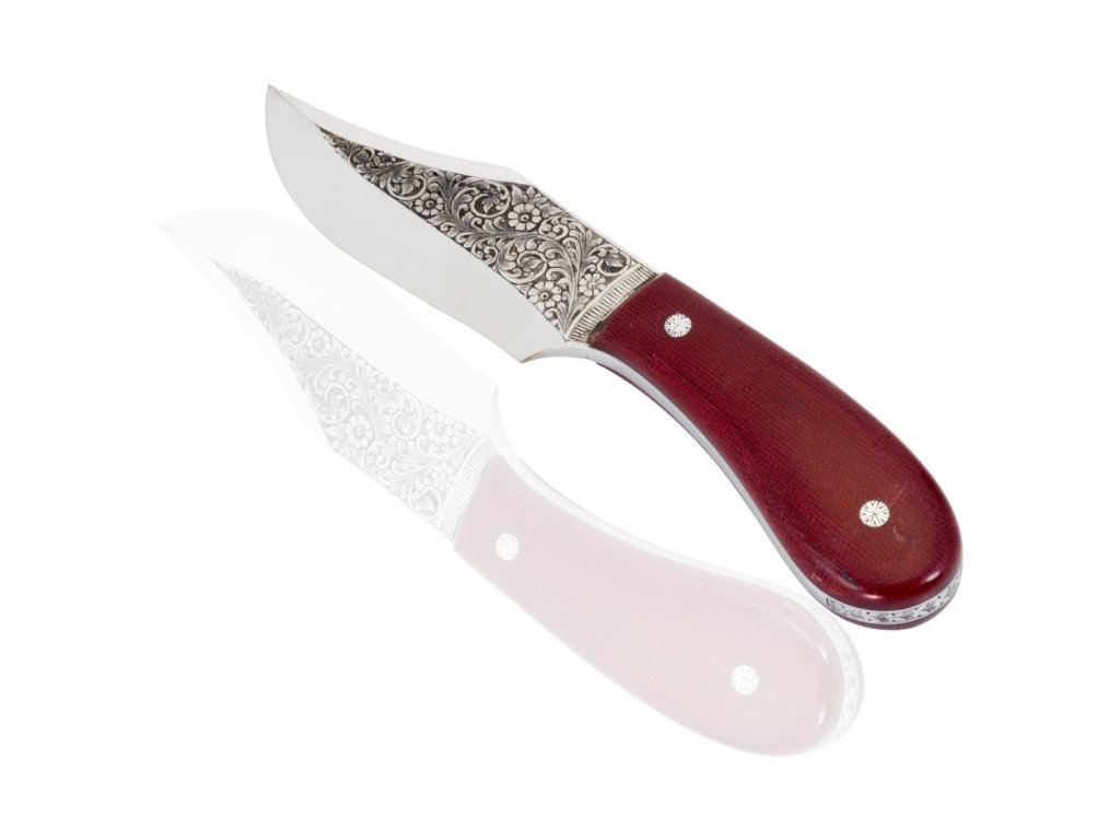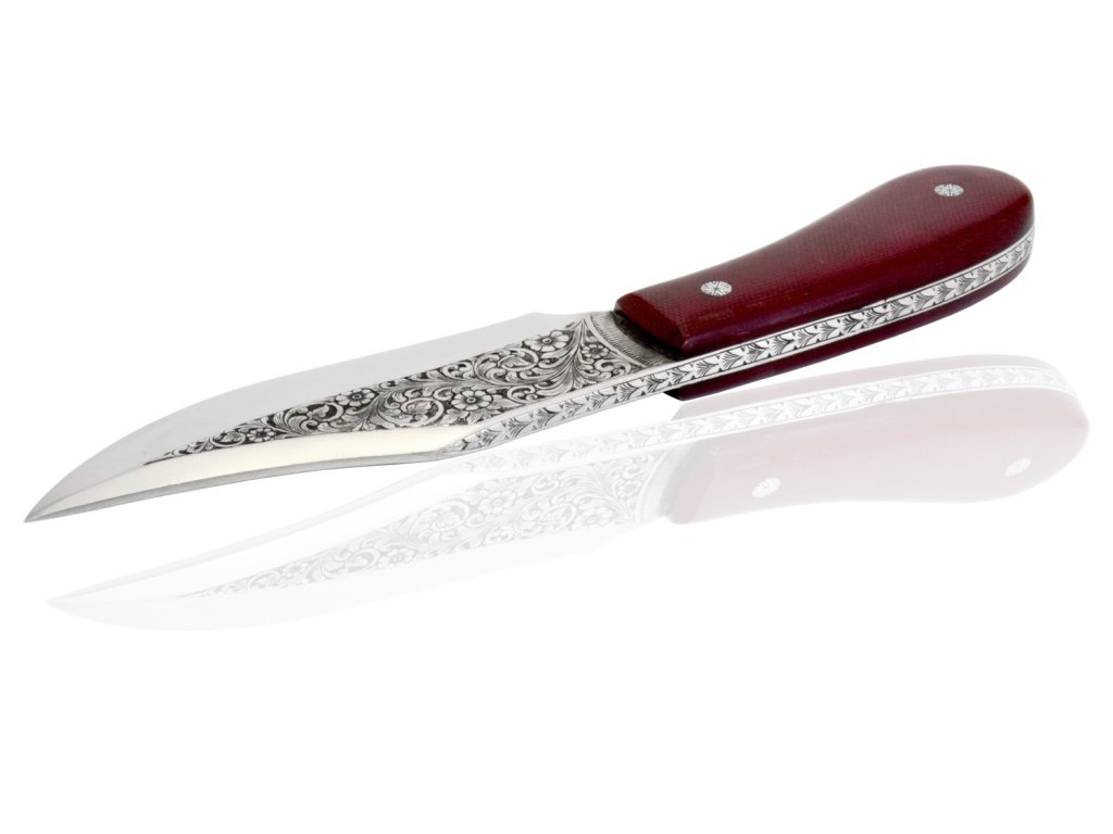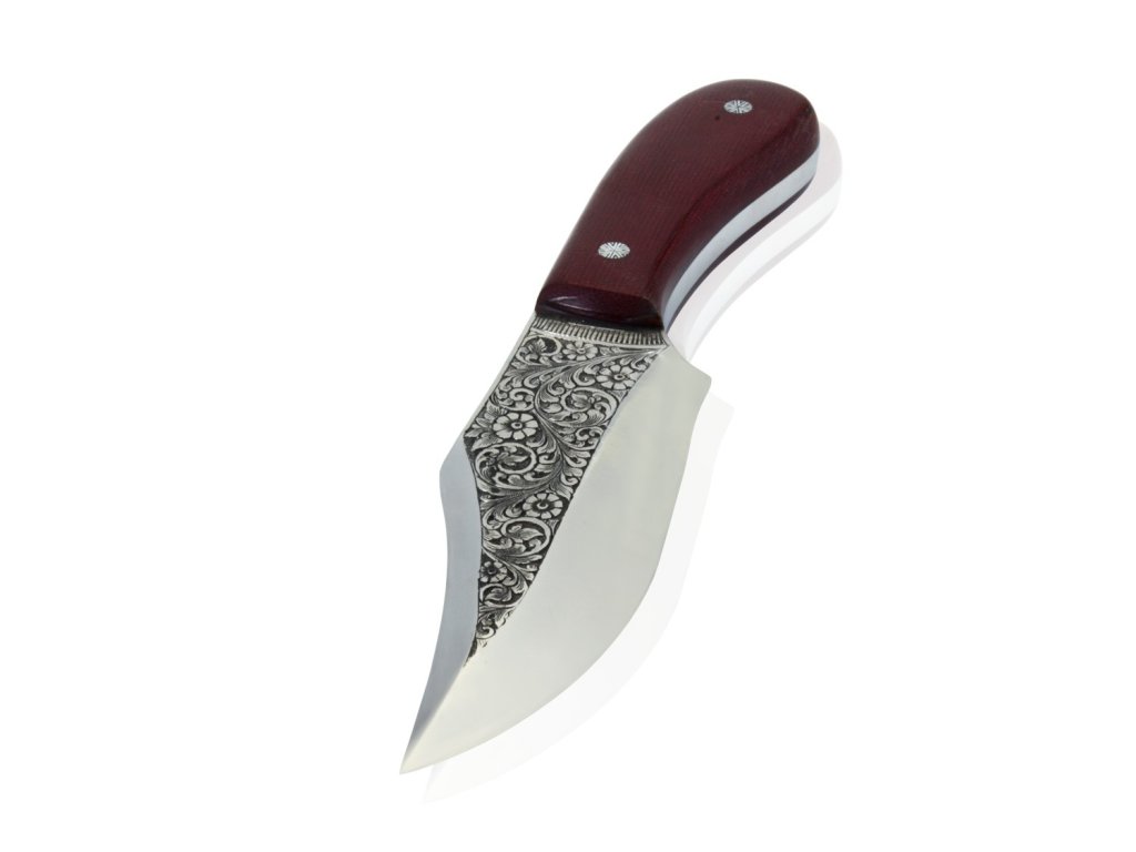 Nůž Dellinger "D2" Zebra Wood Engraved je exkluzivní lovecký nůž s pevnou čepelí a rukojetí vyrobenou z micarty a Zebra Wood (dřevo zebrového vzoru). Tento nůž je ručně kovaný a zpracovaný z oceli D2, která je známá svou vysokou tvrdostí Rockwell 60-62 (HRC), díky přesnému vytvrzení, temperování a žíhání.