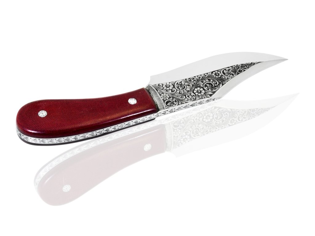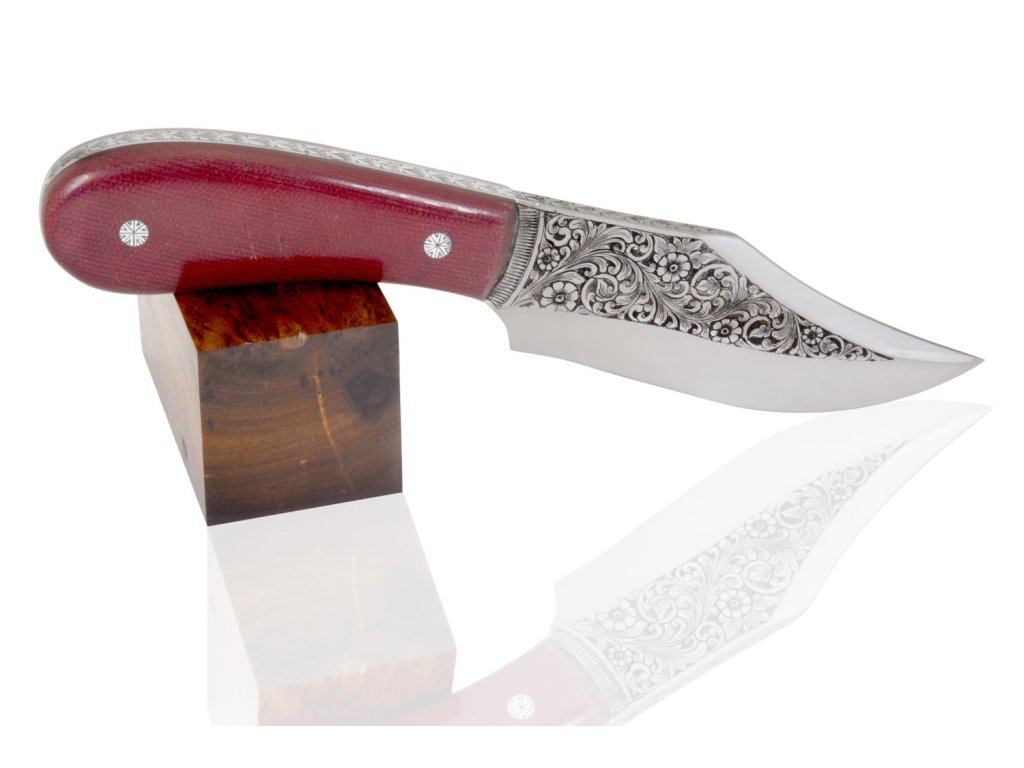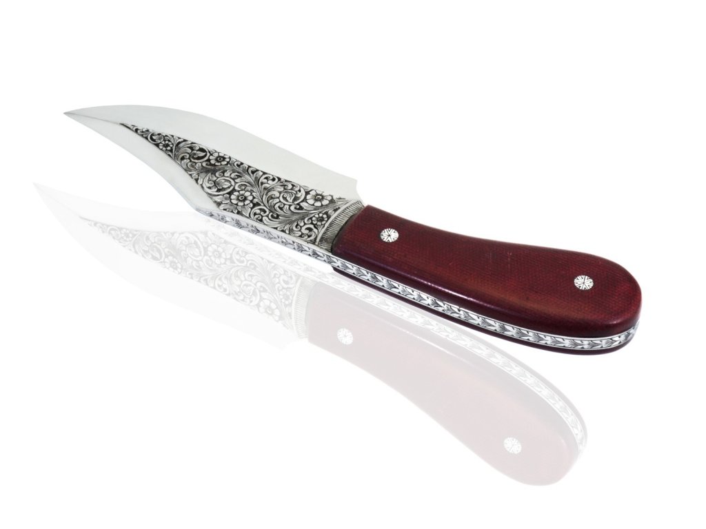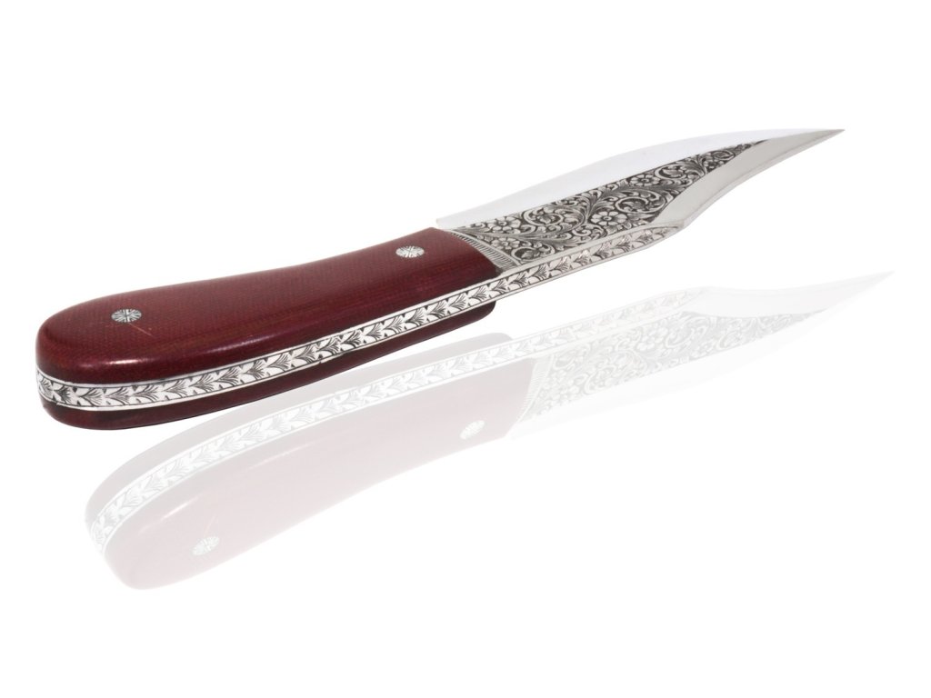 Nůž Dellinger "D2" Zebra Wood Engraved je exkluzivní lovecký nůž s pevnou čepelí a rukojetí vyrobenou z micarty a Zebra Wood (dřevo zebrového vzoru). Tento nůž je ručně kovaný a zpracovaný z oceli D2, která je známá svou vysokou tvrdostí Rockwell 60-62 (HRC), díky přesnému vytvrzení, temperování a žíhání.