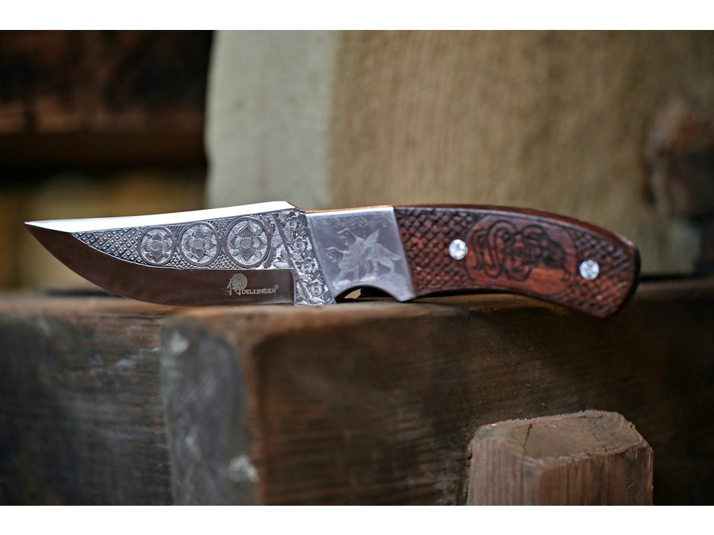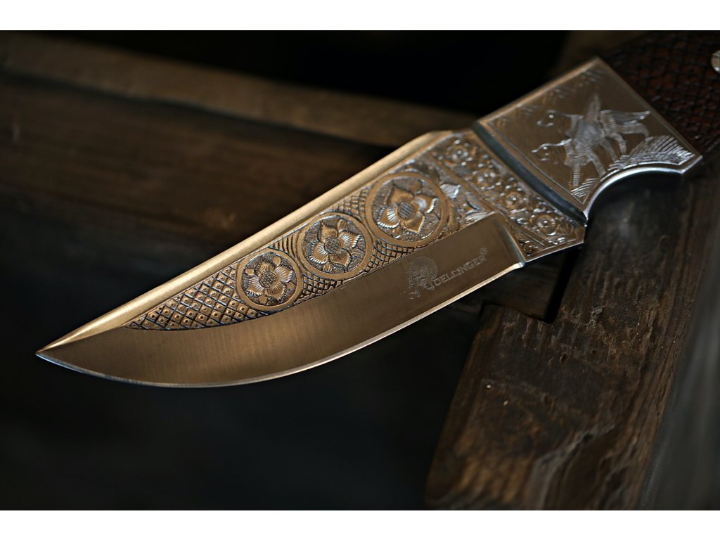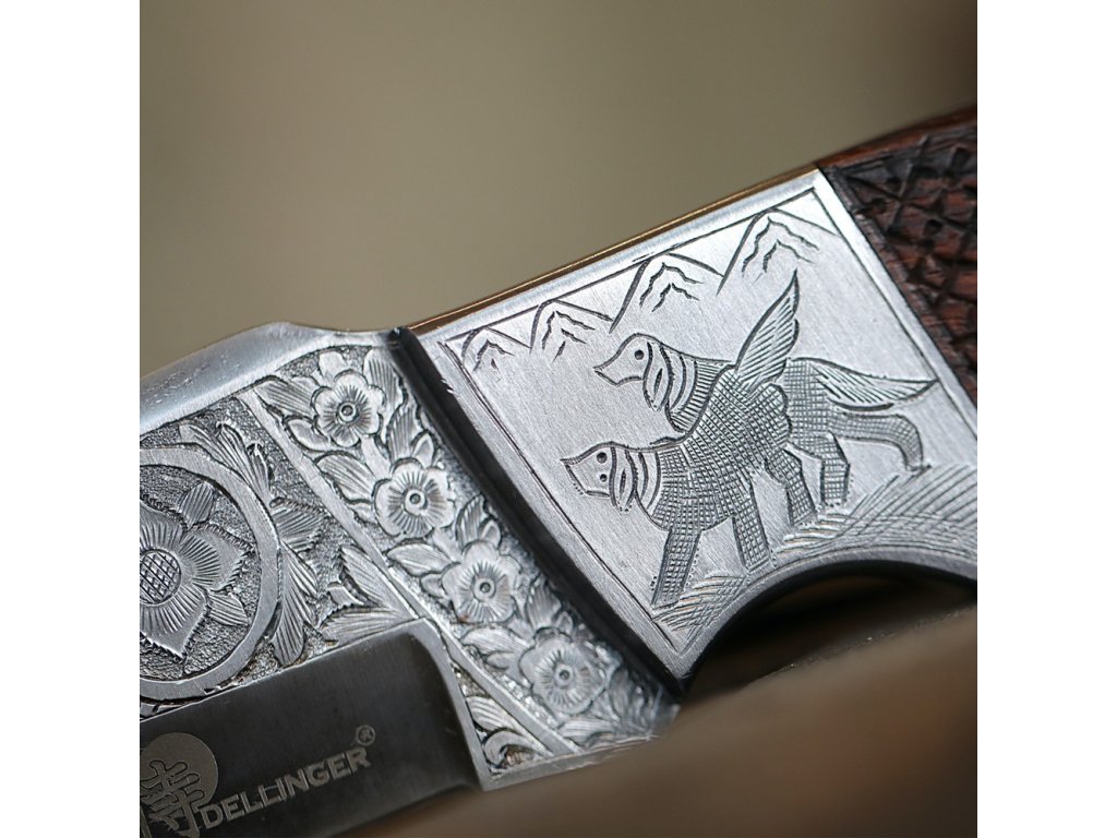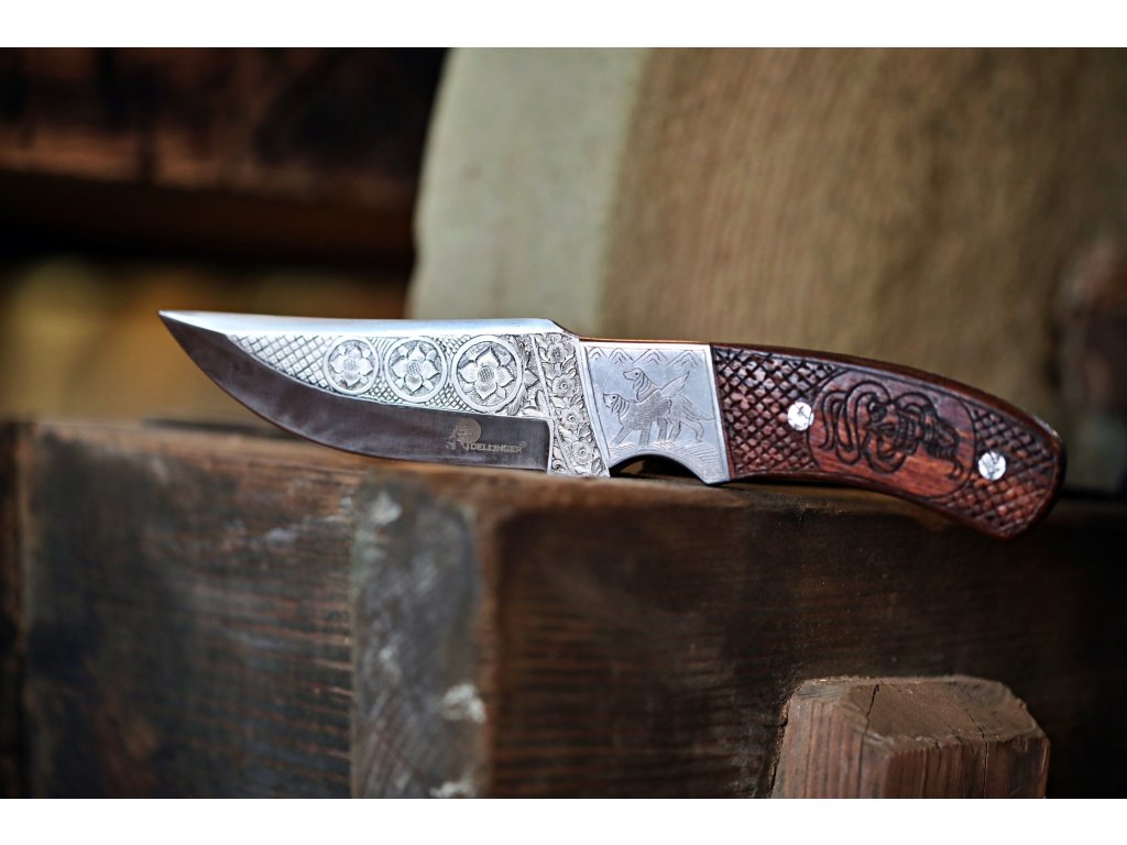 Nůž Dellinger "D2" Engraved II je exkluzivní lovecký nůž s ručně kovanou pevnou čepelí z oceli D2, která byla pečlivě kalena, temperována a žíhána na tvrdost Rockwell 60-62 HRC. Zde jsou klíčové informace o tomto noži: