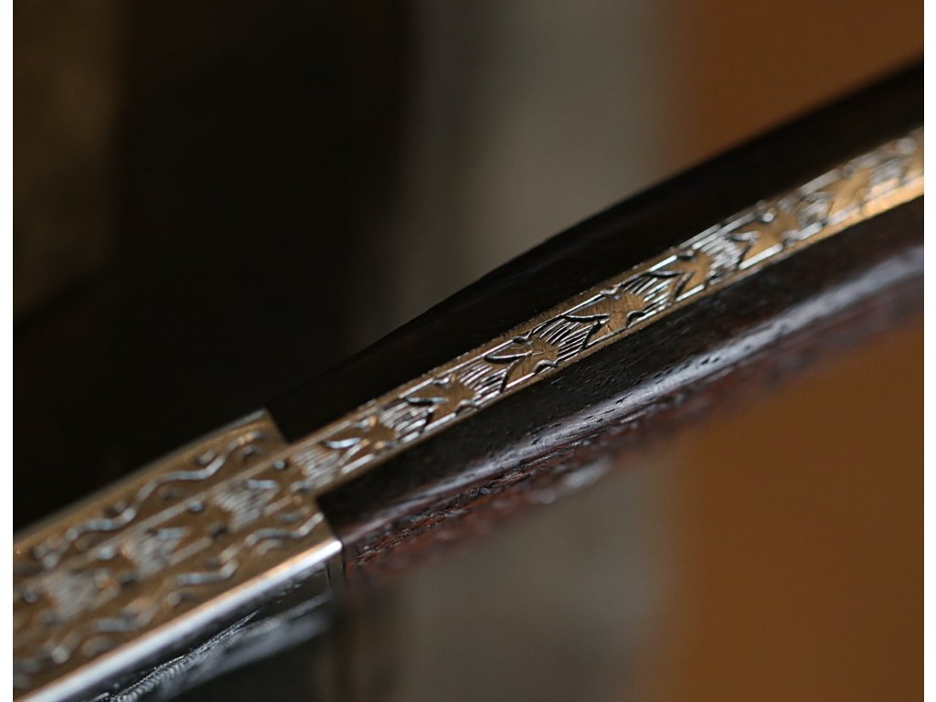 Rukojeť: Opletená hovězí kůží, což poskytuje pevný úchop a estetický vzhled.