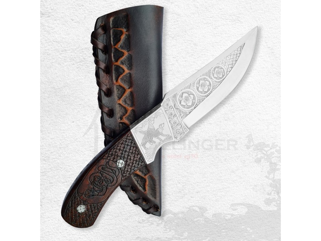 Čepel: Vyrobená z oceli D2, známé svou vysokou tvrdostí a odolností. Rytec se nezaměnitelně podepsal na čepeli, čímž vytvořil jedinečnou uměleckou kresbu.