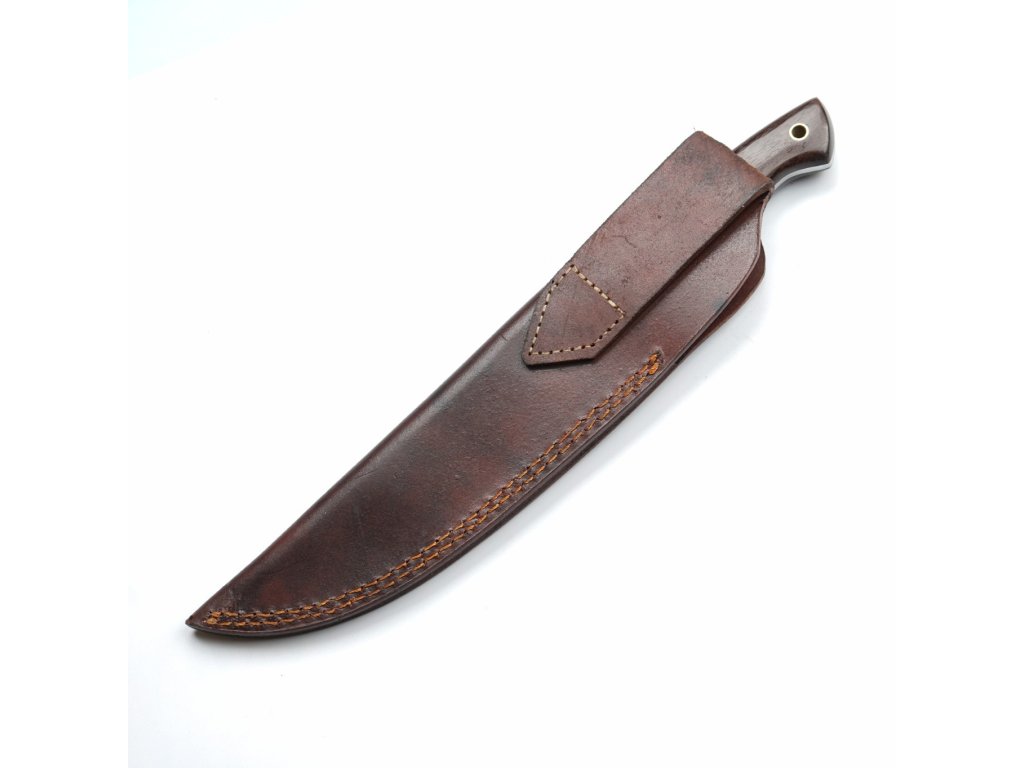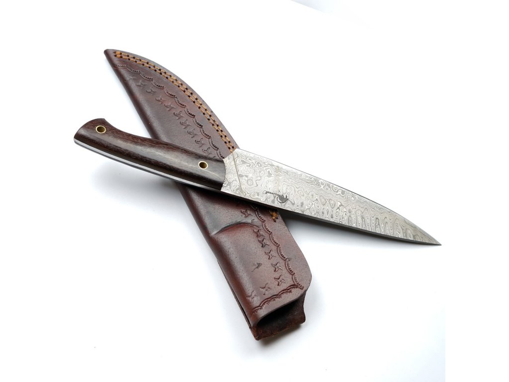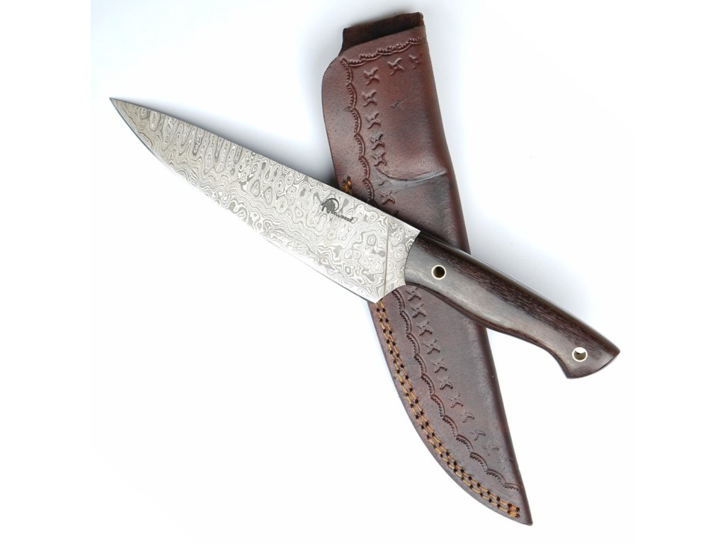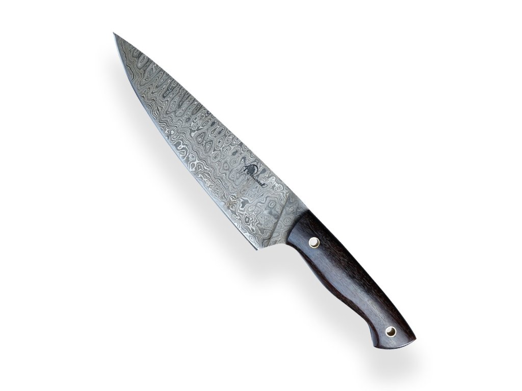 Překrásný ručně kovaný kuchařský damaškový nůž Dellinger Damascus Iron Cook s rukojetí z wenge wood, působivým designem a nejvyšší kvalitou, dodávaný včetně koženého pouzdra.