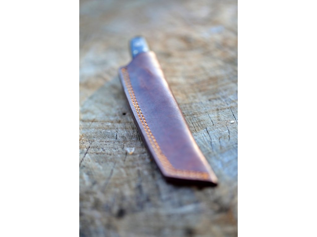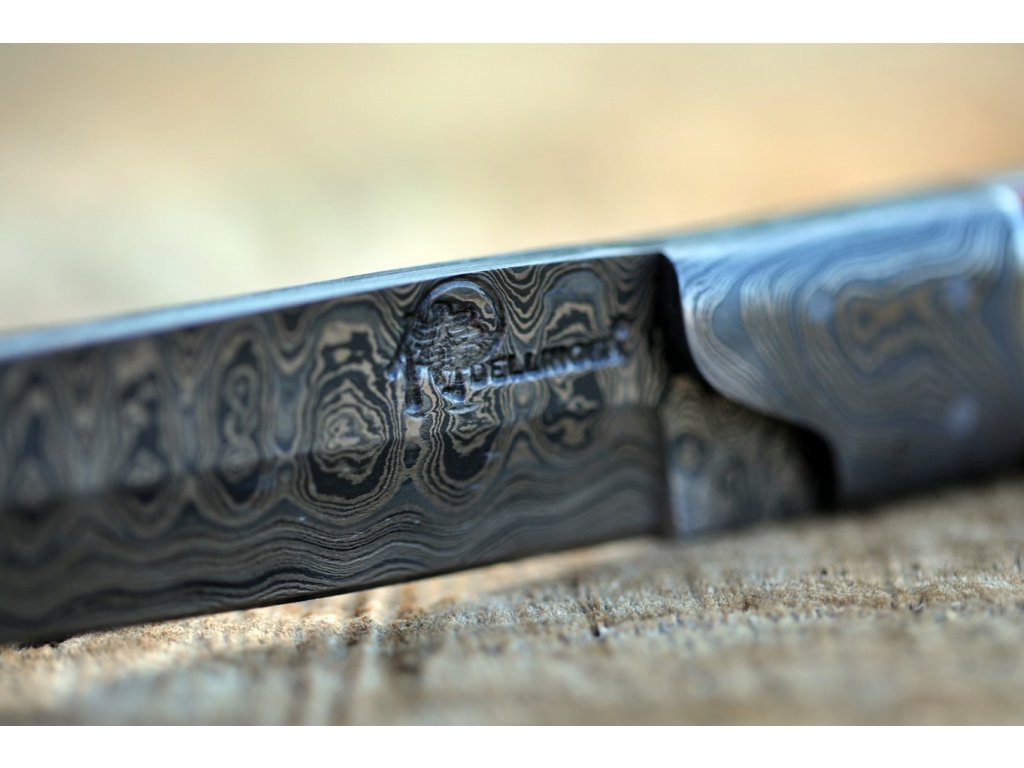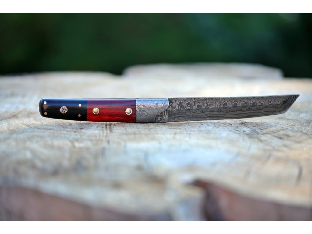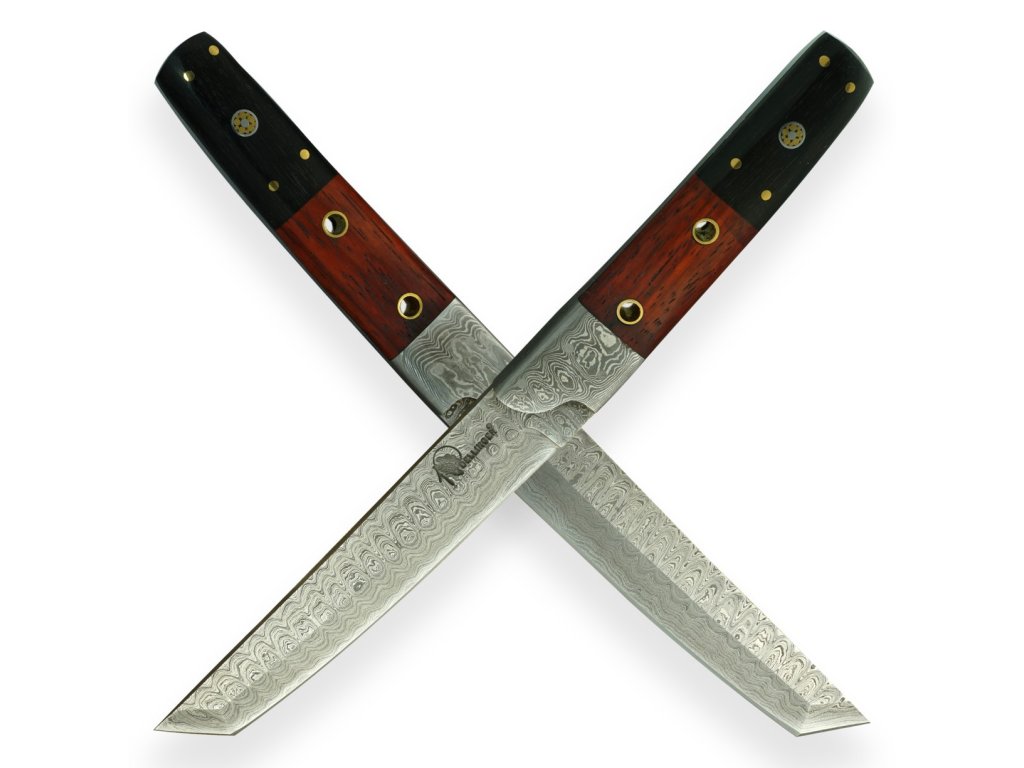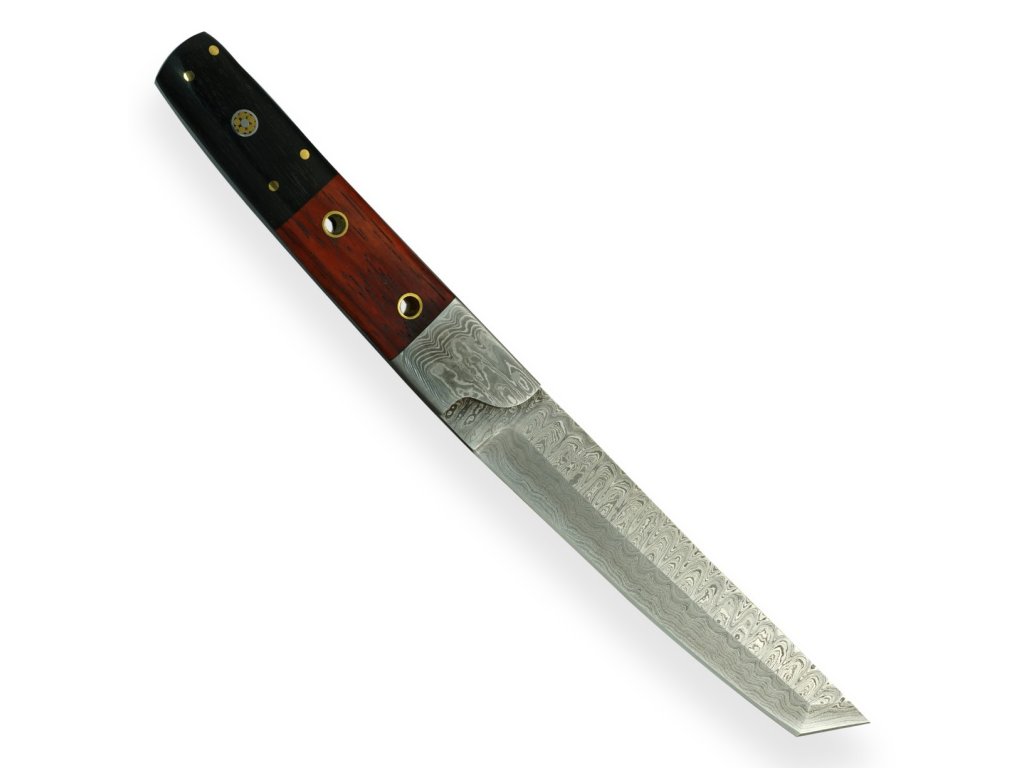 Čepel: Damaská ocel z 352 vrstev (1095 a 15n20) poskytuje vysokou ostrost a trvanlivost ostří díky vysokému obsahu uhlíku v oceli 1095. Tanto ostří je charakteristické svou vysokou čepelí a plochým broušením, což zajišťuje extrémní sílu průniku.
